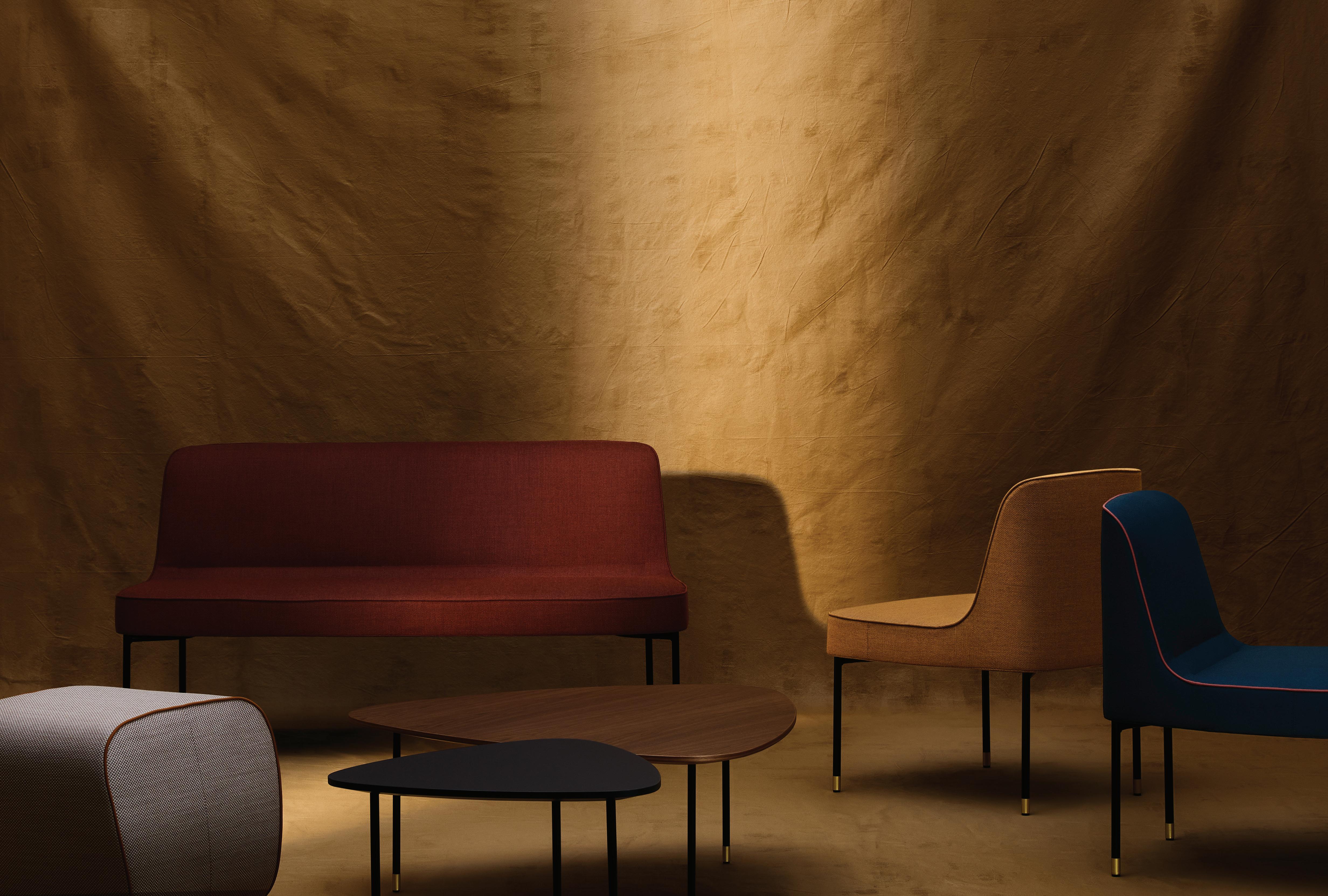 A sophisticated seating and table collection with carefully refined details. Tailored upholstery mixes with the slim leg in anodised gold or charcoal feet giving the pieces an appearance of lightness and luxury.