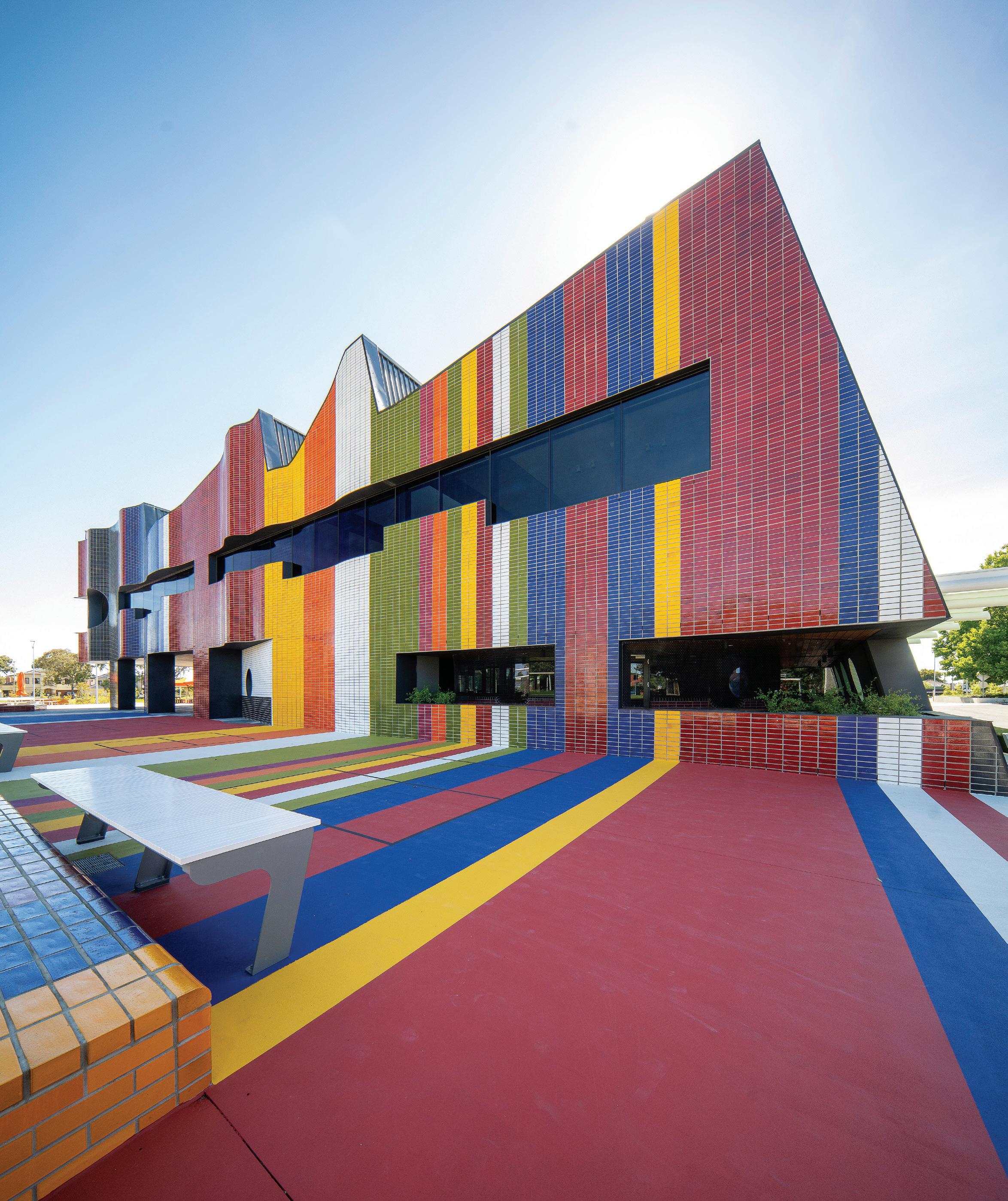 South façade panels –Magnatite, Smurfist power coat, Dulux . Ultriva Bondi Blue powder coat, Interpon East façade panels – Duralloy Manor red matte, and Intensity Desert Satin powder coat, Dulux . West façade