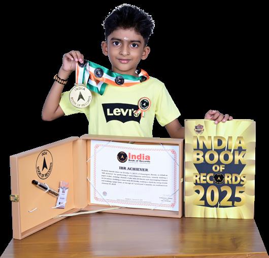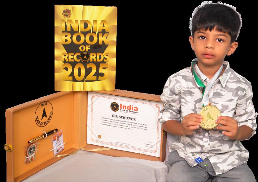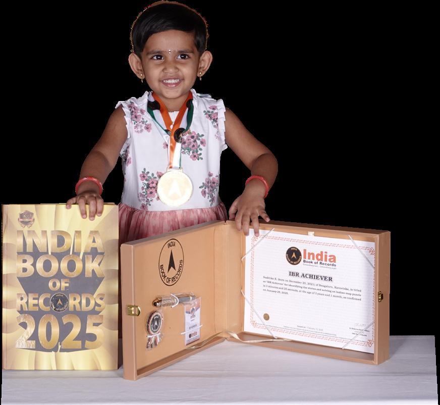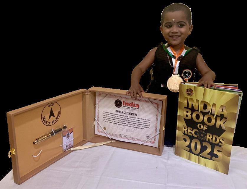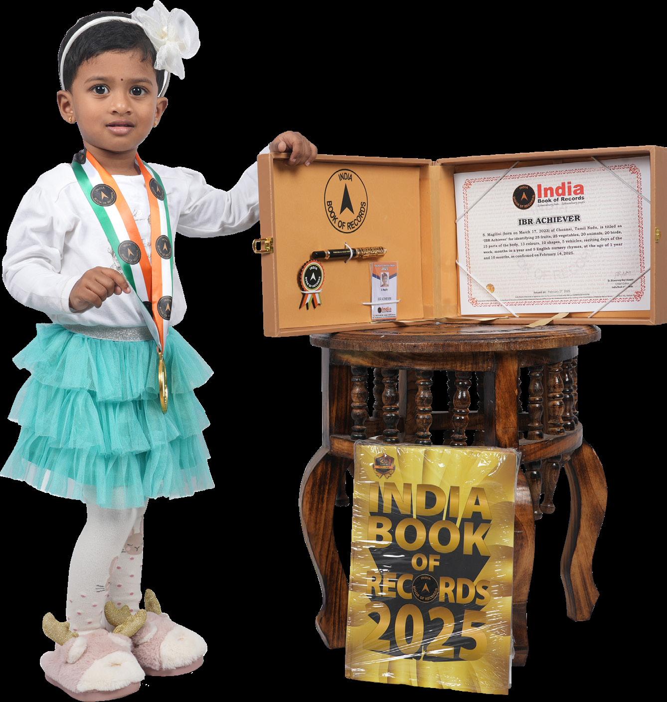 V. S. Vriksha (born on November 24, 2021) of Coimbatore, Tamil Nadu, has been titled as ‘IBR Achiever’ for identifying 62 miscellaneous items, 12 English words and 3 types of angles; reciting 5 Thirukkurals and 5 paragraphs of Kanda Sashti Kavacham; solving 4 puzzles, including three 5-piece puzzles (car, mango, grapes) and a single Montessori slide colour puzzle, at the age of 3 years and 1 month, as confirmed on January 8, 2025.