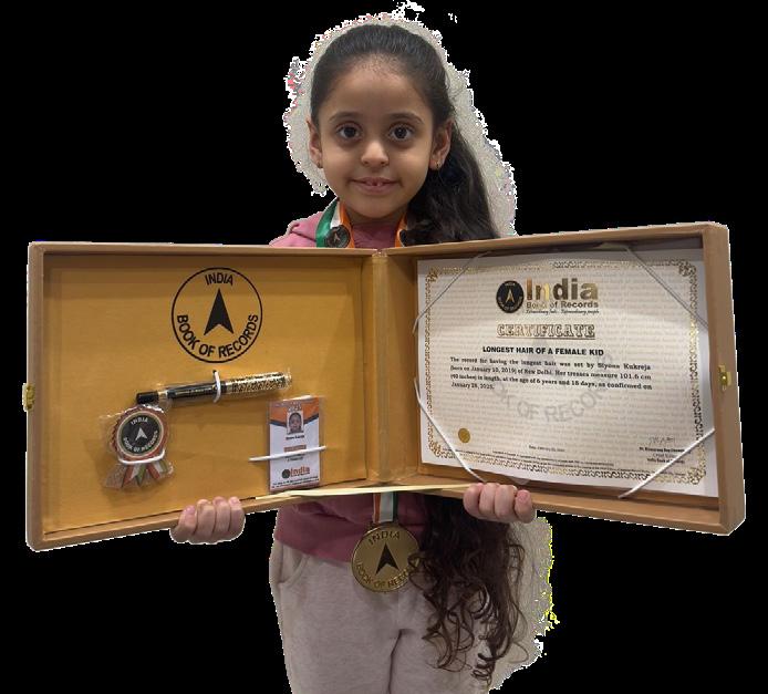 The record for having the longest hair was set by Siyona Kukreja (born on January 10, 2019) of New Delhi. Her tresses measure 101.6 cm (40 inches) in length, at the age of 6 years and 18 days, as confirmed on January 28, 2025.
