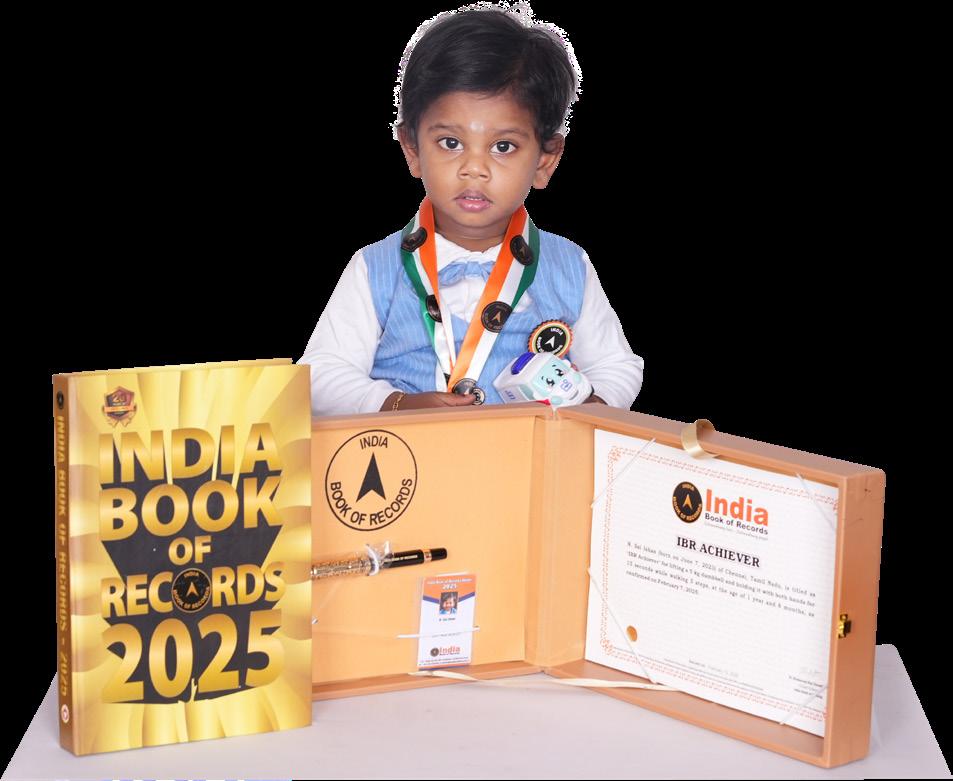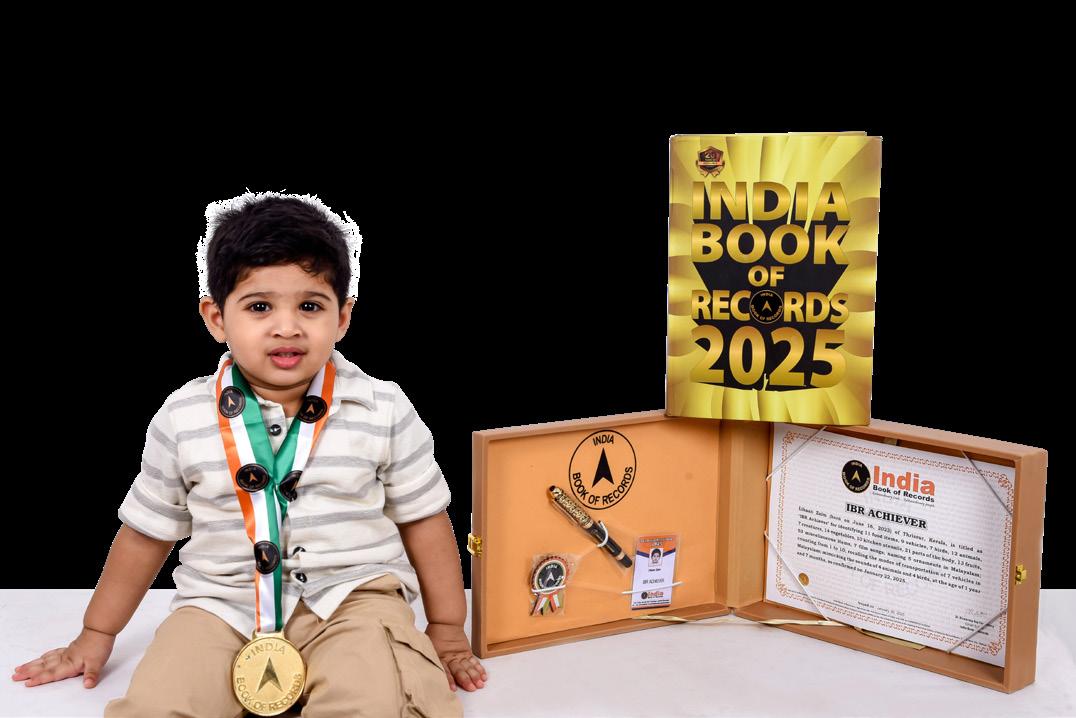 Ivaan V. (born on February 28, 2023) of Kollam, Kerala, is titled as ‘IBR Achiever’ for identifying and reciting 5 colours, 8 parts of the body, 10 vehicles, 4 professions, 10 animals, 7 birds, 10 fruits, 13 miscellaneous items; mimicking the sounds of 4 animals and performing 7 actions, at the age of 1 year and 10 months, as confirmed on January 16, 2025.