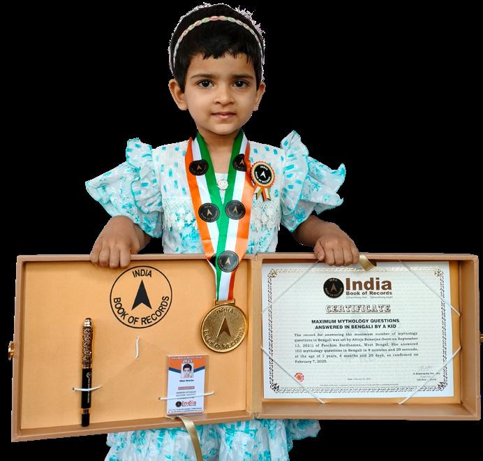 The record for answering the maximum number of mythology questions in Bengali was set by Attoja Banerjee (born on September 13, 2021) of Paschim Bardhaman, West Bengal. She answered 103 mythology questions in Bengali in 8 minutes and 29 seconds, at the age of 3 years, 4 months and 25 days, as confirmed on February 7, 2025.