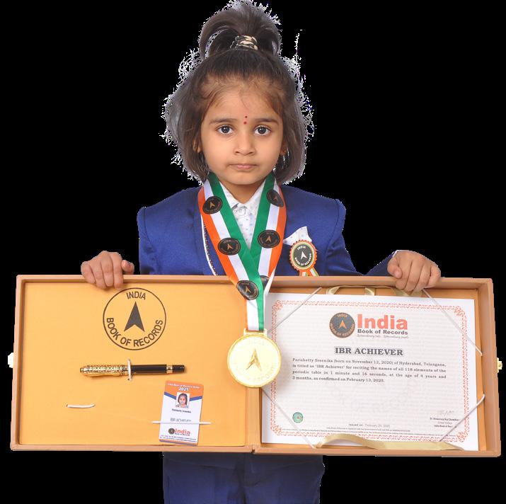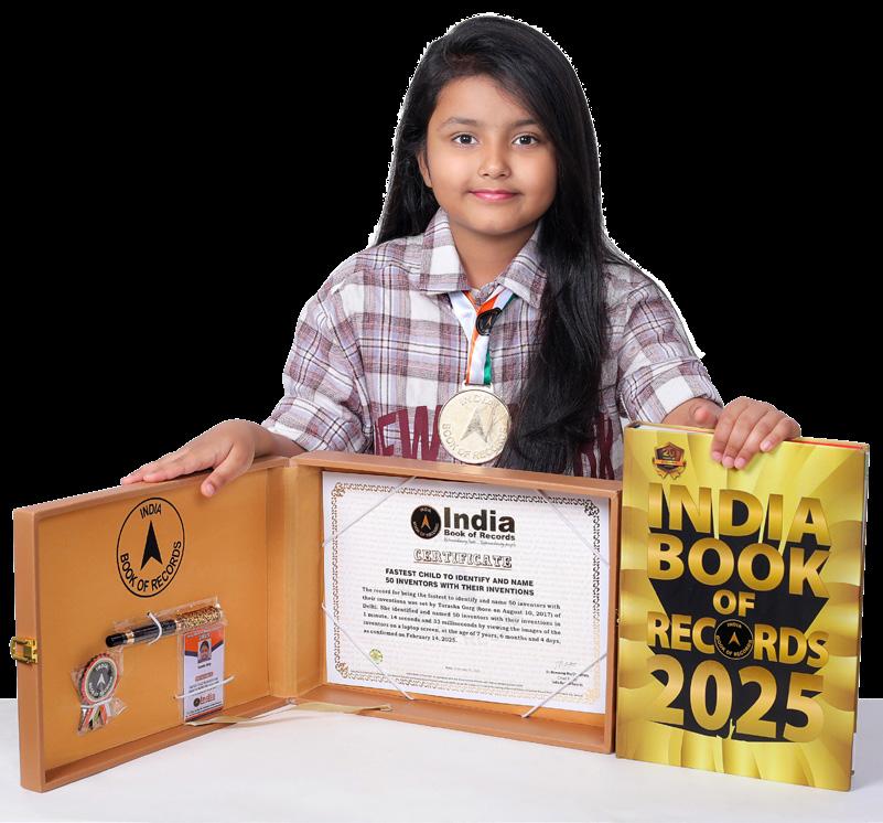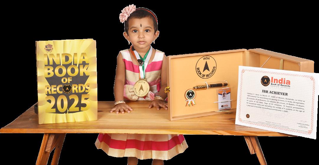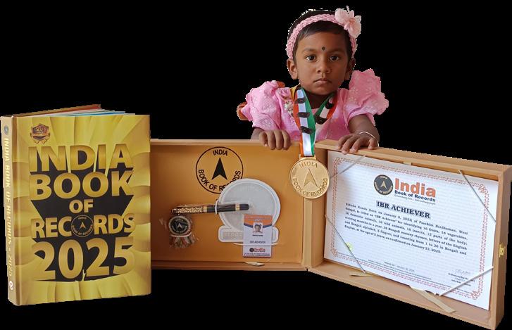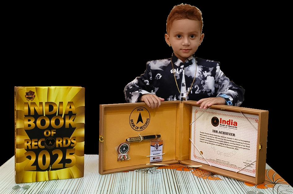 Tanishv Pranita Satish Kamtikar (born on January 4, 2021) of Aurangabad, Maharashtra, is titled as ‘IBR Achiever’ for identifying and naming 9 colours, 9 shapes, 9 wild animals, 12 domestic animals; reciting letters of the Hindi alphabet with associated words; singing the National Anthem and a patriotic song, at the age of 4 years, on January 28, 2025.