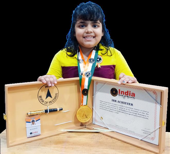 Aahana Anand (born on August 6,2018) of Ahmedabad, Gujarat, is titled as ‘IBR Achiever’ for recalling the names of all the Presidents of USA. She recalled the names of all the 47 US Presidents from George Washington to Donald Trump in 1 minute and 38 seconds, at the age of 6 years and 5 months, as confirmed on January 11, 2025.