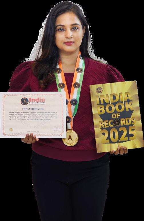 Ardra S. Raj (born on September 3, 2000) of Thiruvananthapuram, Kerala, is titled as ‘IBR Achiever’ for creating a face art inspired by Kathakali dance of Kerala. She completely painted her face depicting the dramatic expression of a Kathakali dancer in hues of red, green, white and black in 4 minutes and 40 seconds, using acrylic paints, as confirmed on February 8, 2025.