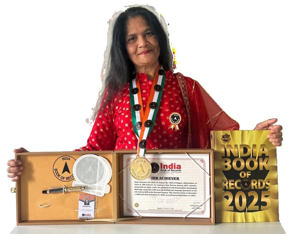 This certificate is awarded to Shilpa pankaj Kasliwal for making a Veer Nirvaan Samvat 2551 calendar, along with her sister, under the guidance of 108 Acharyashree Sunilsagarji Maharajji, using the 2,300 year-old Brahmi Lipi language (prevalent in the 3rd century BCE in the Mauryan Empire). The calendar starts on November 1, 2024 and ends on October 31, 2025, as confirmed on November 14, 2024.