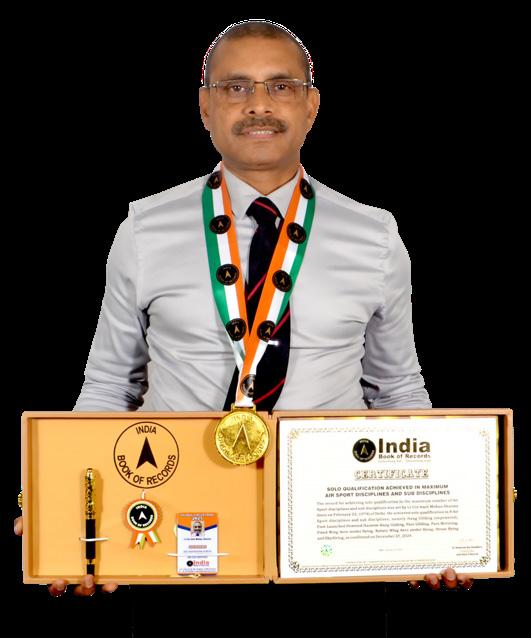 The record for achieving solo qualification in the maximum number of Air Sport disciplines and sub disciplines was set by Lt Col Amit Mohan Sharma (born on February 22, 1974) of Delhi. He achieved solo qualification in 8 Air Sport disciplines and sub disciplines, namely Hang Gliding (unpowered), Foot Launched Powered Harness Hang Gliding, Para Gliding, Para Motoring, Fixed Wing Aero model flying, Rotary Wing Aero model flying, Drone flying and Skydiving, as confirmed on December 25, 2024.