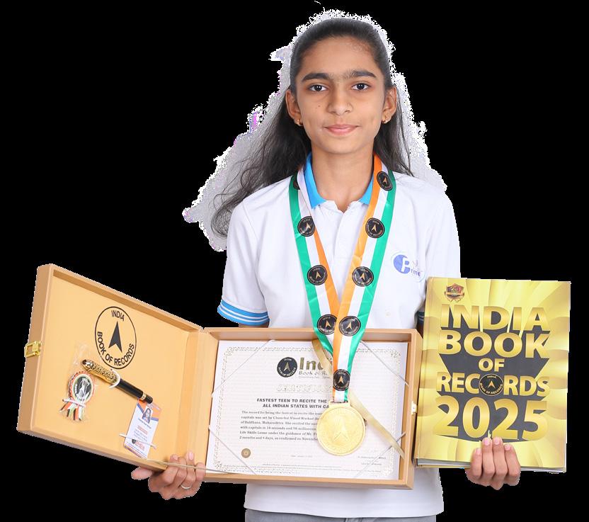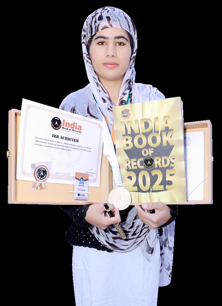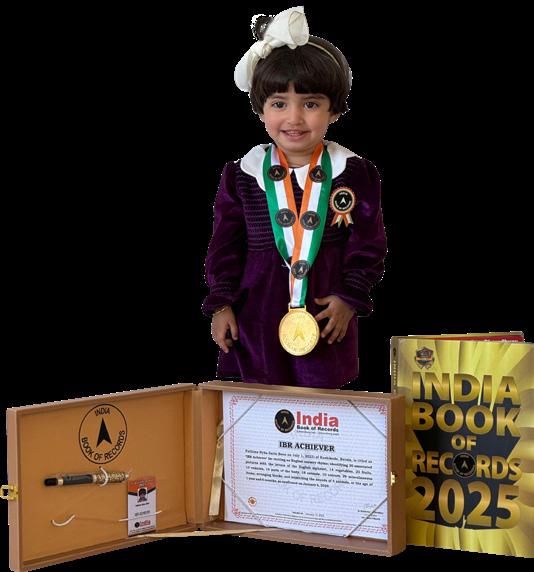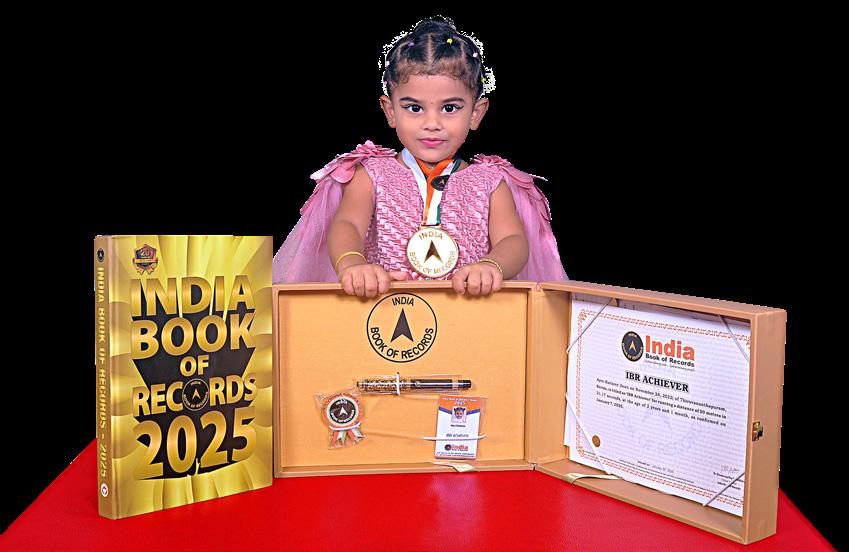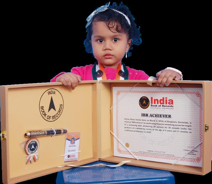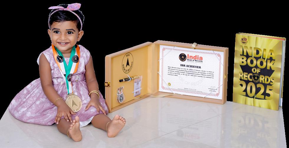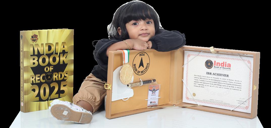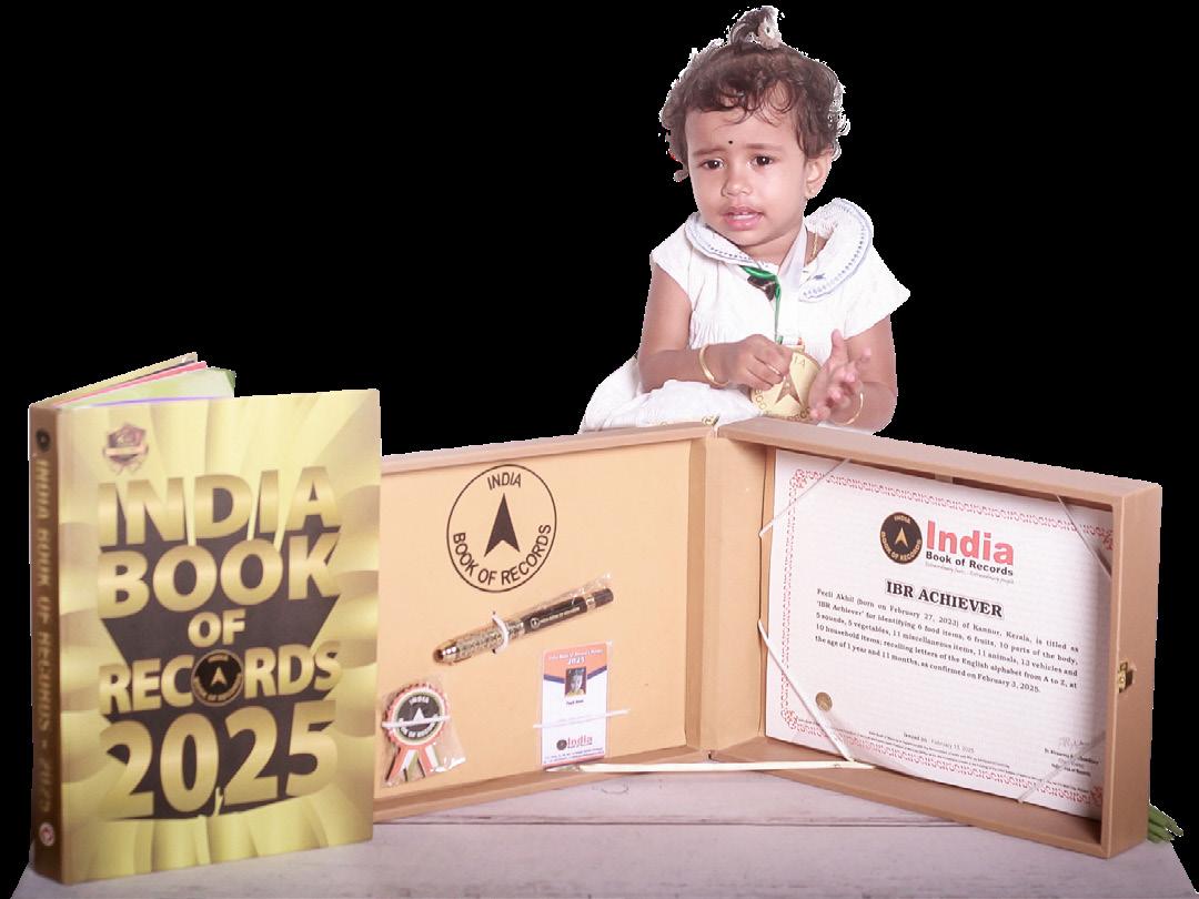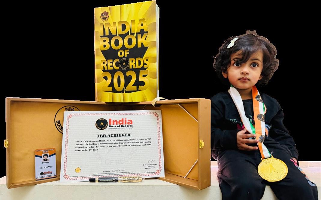 Ayma Amrin Ramshad (born on May 26, 2023) of Kozhikode, Kerala, is titled as ‘IBR Achiever’ for identifying 10 miscellaneous items, 9 fruits, 8 vehicles, 7 vegetables, 4 animals; imitating the sounds of 4 animals; lifting and carrying a 3.45 kg flower pot for 25 seconds, at the age of 1 year and 7 months, as confirmed on January 24, 2025.