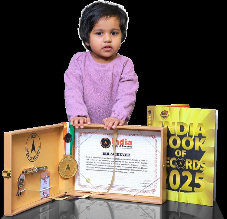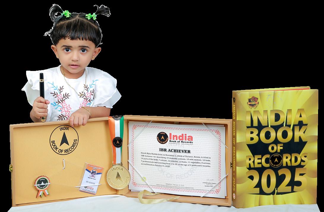 Aysha Ifza Hairin P. F. (born on October 16, 2022) of Kannur, Kerala, is titled as ‘IBR Achiever’ for identifying 21 animals, 8 birds, 14 vegetables, 12 fruits, 11 parts of the body, 15 vehicles, reciting 3 English nursery rhymes; 1 to 10, at the age of 2 years and 2 as confirmed on January 10, 2025.