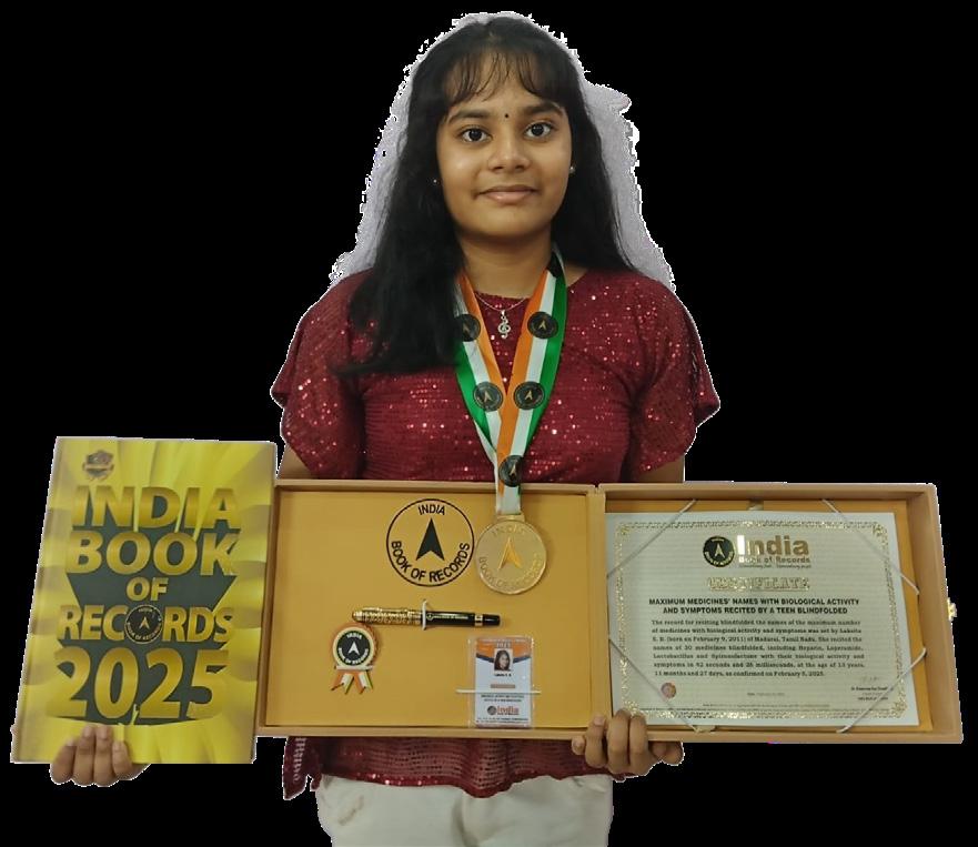 The record for reciting blindfolded the names of the maximum number of medicines with biological activity and symptoms was set by Laksita S. B. (born on February 9, 2011) of Madurai, Tamil Nadu. She recited the names of 30 medicines blindfolded, including Heparin, Loperamide, Spironolactone with their biological activity and symptoms in milliseconds, at the age of 13 years, 11 months and 27 days, as confirmed on 2025.