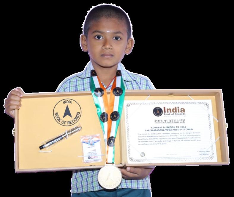 The record for holding the Vajrasana yoga pose for the longest duration was set by Arasu Padavettan (born on January 7, 2015) of Tiruvannamalai, Tamil Nadu. He held the Vajrasana yoga pose (Thunderbolt Pose) for 1 hour, 30 minutes and 27 seconds, at the age of 9 years, 11 months and 27 days, as confirmed on January 3, 2025.