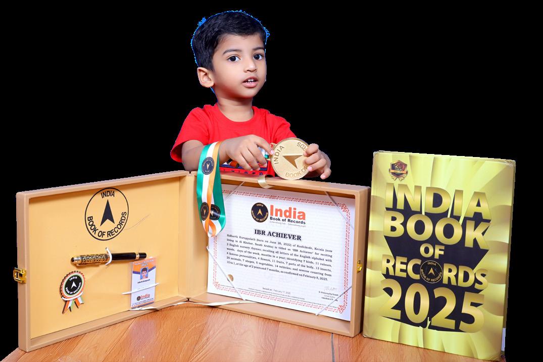 Aqid Zahroon (born on February 20, 2021) of Kannur, Kerala , is titled as ‘IBR Achiever’ for identifying and naming 36 animals, 19 parts of the body, 13 fruits, 20 vegetables, 10 birds, 10 insects, 10 colours, 8 shapes, 20 vehicles, 19 electronic items, 41 household items, 15 stationery items, 10 logos, 6 avengers, 5 occupations, 54 miscellaneous items, 10 dresses; counting from 1 to 15; and 21 G.K. questions, age of 3 years and 11 as confirmed on January 28, 2025.