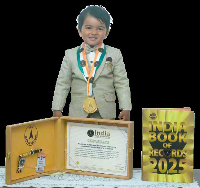 The record for answering the maximum number of questions on the solar system and space was set by Jude Maynard Khyriem (born on March 26, 2022) of Shillong, Meghalaya. He answered 76 questions on the solar system and space in 14 minutes and 43 seconds, at the age of 2 years, 10 months and 2 days, as confirmed on January 28, 2025.