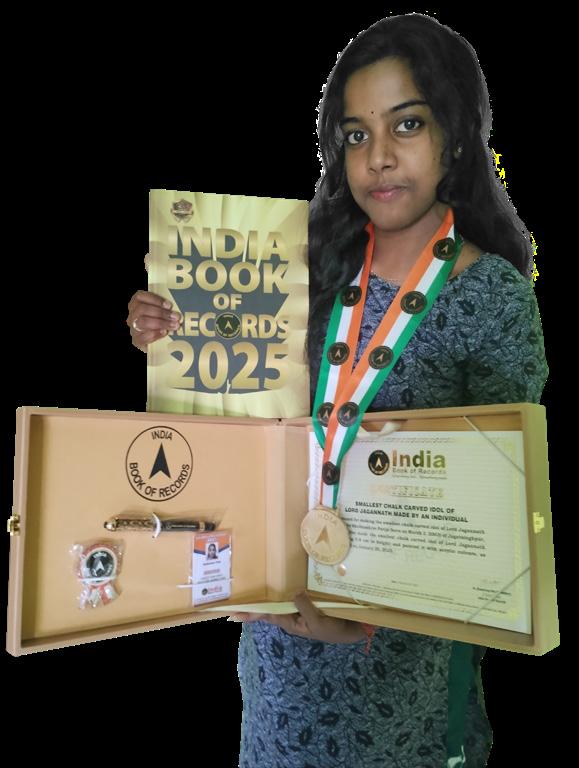 The record for making the smallest chalk carved idol of Lord Jagannath was set by Shubhashree Parija (born on March 2, 2003) of Jagatsinghpur, Odisha. She made the smallest chalk carved idol of Lord Jagannath (measuring 0.8 cm in height) and painted it with acrylic colours, as confirmed on January 28, 2025.