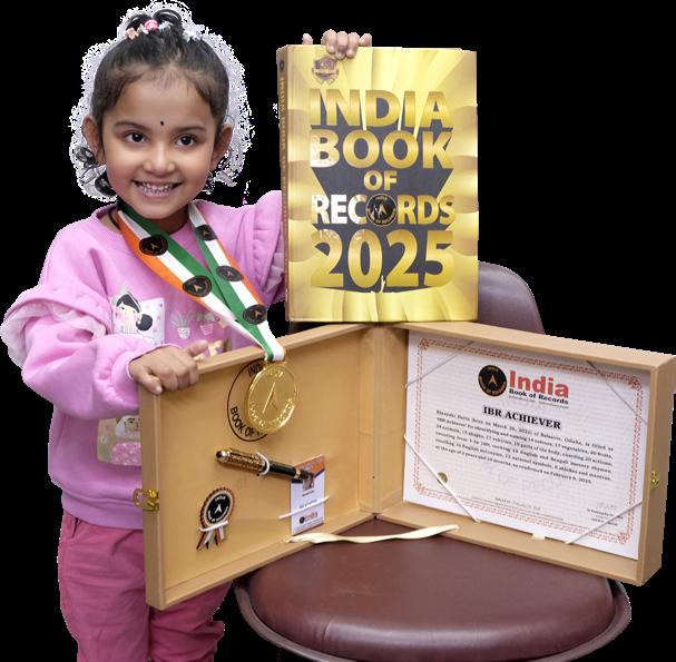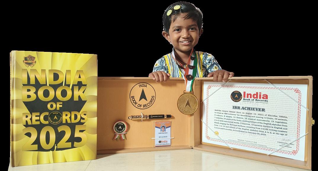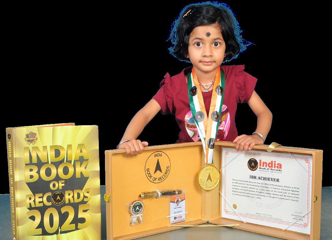 Bignes Behera (born on August 23, 2022) of Kendrapara, Odisha, is titled as ‘IBR Achiever’ for identifying and naming 20 fruits, 15 colours, 48 animals, 12 shapes, 20 flowers, 16 birds, 16 musical instruments, 20 vegetables, 20 famous personalities, 15 vehicles, 20 parts of the body; reciting letters of the English alphabet from A to Z with associated words, days of the week, months in a year, 8 planets, 6 seasons; recalling capitals of all Indian states; and answering 16 G.K. questions, at the age of 2 years and 6 months, as confirmed on February 24, 2025.