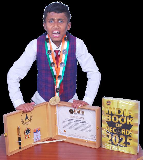 The record for performing the maximum number of yoga poses on a horse was set by R. Sairakshan (born on June 29, 2014) of Krishnagiri, Tamil Nadu. Being specially abled (with 45% Autism Spectrum Disorder), he performed 10 yoga poses on a stationary as well as a moving horse in 4 minutes and 32 seconds by following the instructions of his coach, at the age of 10 years, 7 months and 13 days, as confirmed on February 11, 2025.