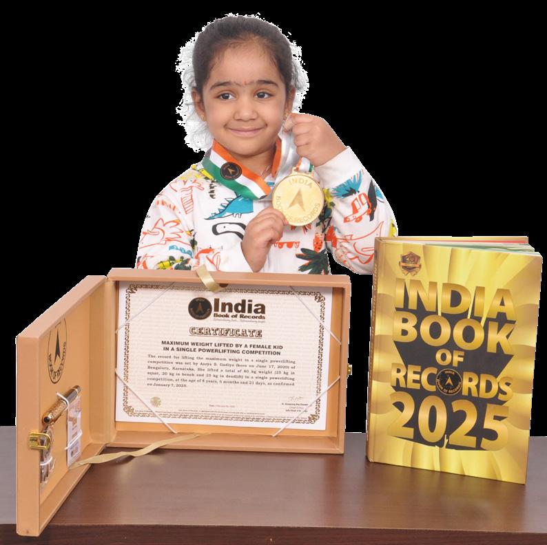 The record for lifting the maximum weight in a single powerlifting competition was set by Aarya S. Gadiya (born on June 17, 2020) of Bengaluru, Karnataka. She lifted a total of 80 kg weight (25 kg in squat, 20 kg in bench and 35 kg in deadlift) in a single powerlifting competition, at the age of 4 years, 6 months and 21 days, as confirmed on January 7, 2025.
