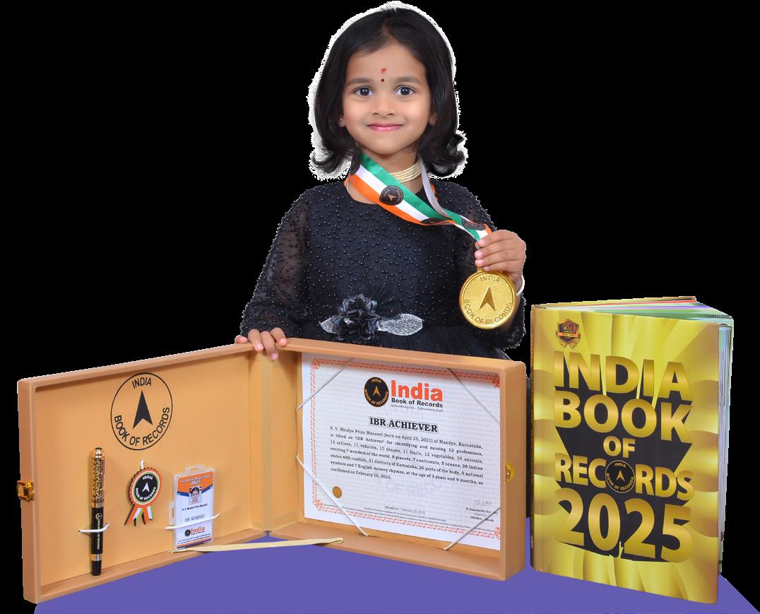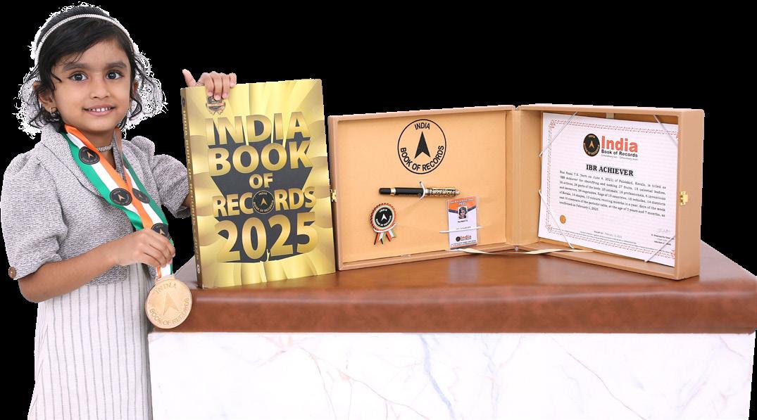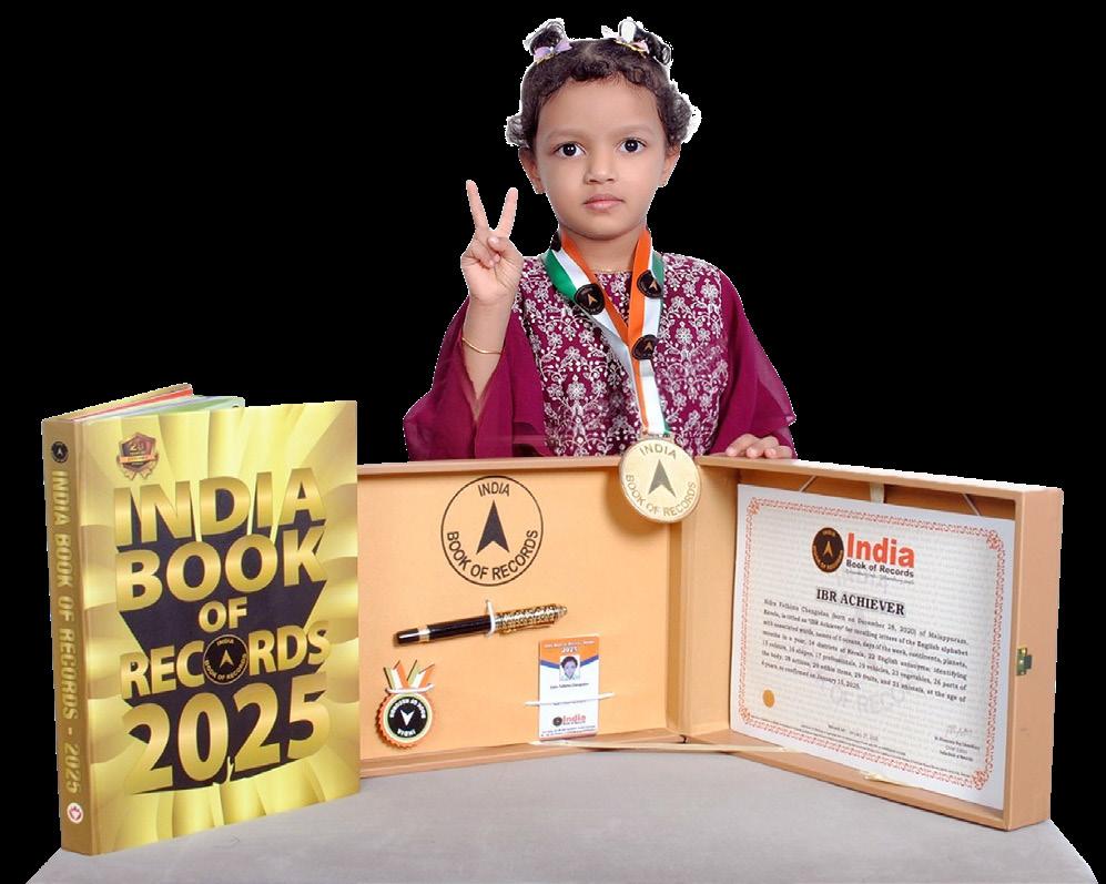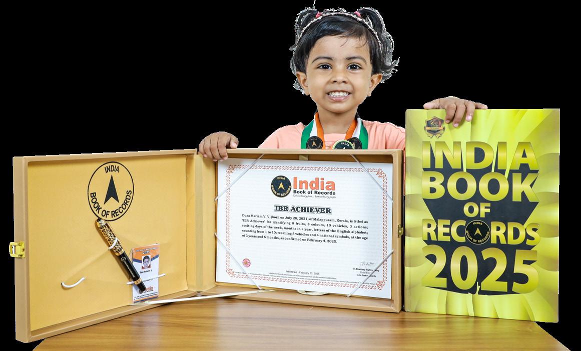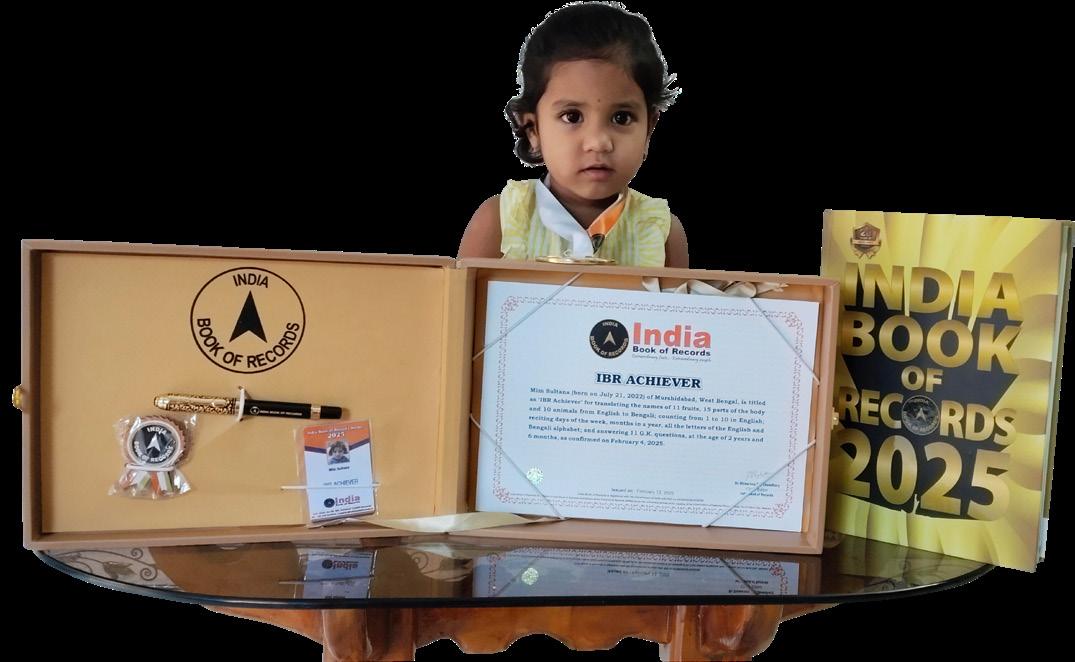 Ayra Maryam (born on April 8, 2021) of Malappuram, Kerala, is titled as ‘IBR Achiever’ for identifying 26 letters of the English alphabet with associated words, 15 wild animals, 15 domestic animals, 6 birds, 15 food items, 8 shapes, 25 fruits, 6 vegetables, 10 vehicles, 17 parts of the body, 12 colours, 20 miscellaneous items; counting numbers from 1 to 20; naming the days of the week; writing all of the English alphabet from A to Z and from 1 to 10 randomly, at the age years and 9 months, as confirmed January 8, 2025.