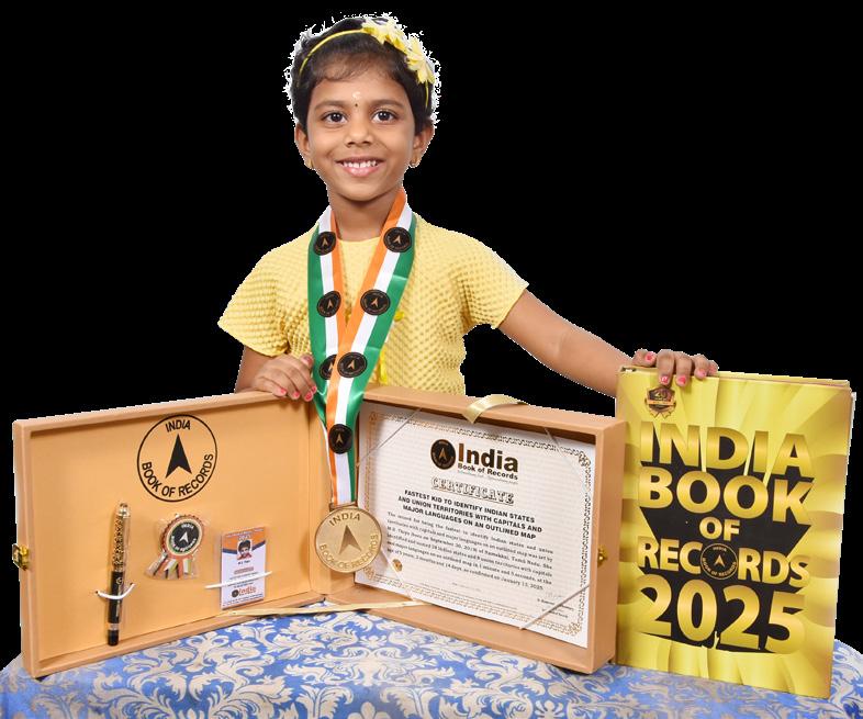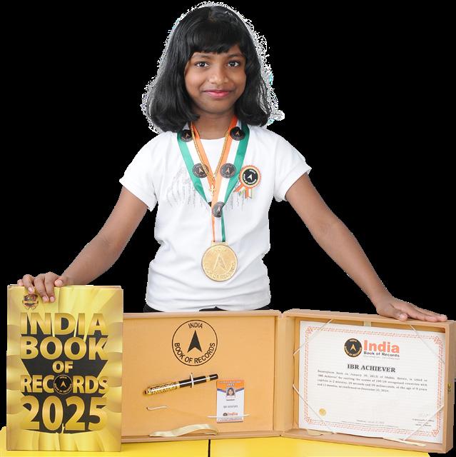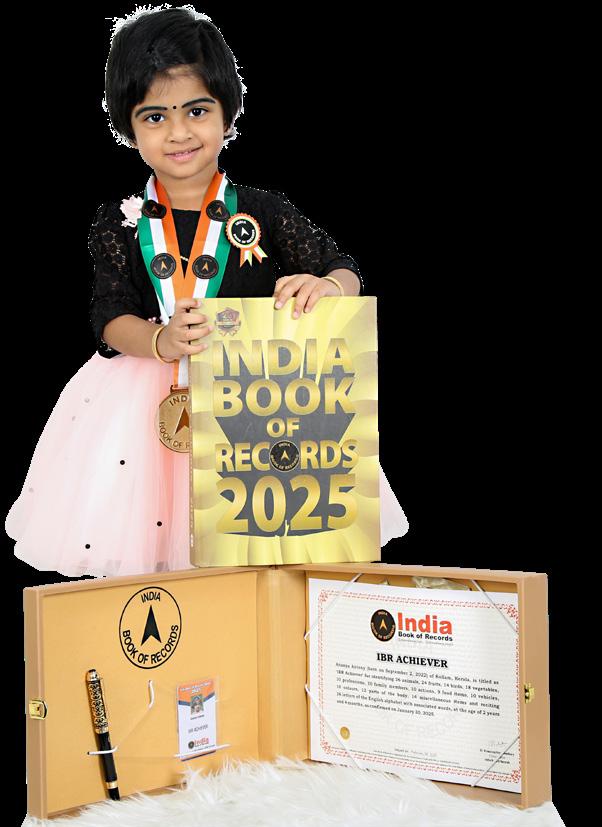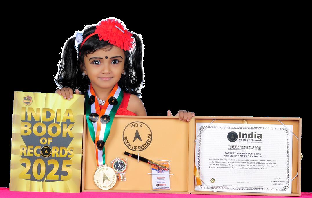 Evana Sriram P. (born on January 5, 2022) of Palakkad, Kerala, is titled as ‘IBR Achiever’ for identifying and naming 12 fruits, 6 vegetables, 8 vehicles, 5 colours, 5 shapes, 5 parts of the body; reciting 2 English nursery rhymes, 27 nakshatras, letters of the English alphabet from A to Z with associated words, months in a year, days of the week; and counting from 1 to 10, at the age of 3 years, as confirmed on January 28, 2025.