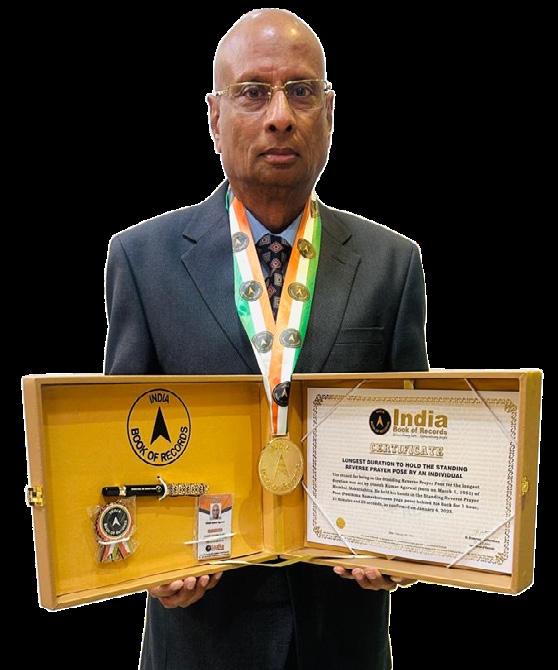 The record for being in the Standing Reverse Prayer Pose for the longest duration was set Dinesh Kumar Agarwal (born on March 1, 1951) of Mumbai, Maharashtra. He held his hands in the Standing Reverse Prayer Pose (Paschima Namaskarasana yoga pose) behind his back for 1 hour, 21 minutes and 20 seconds, as confirmed on January 4, 2025.