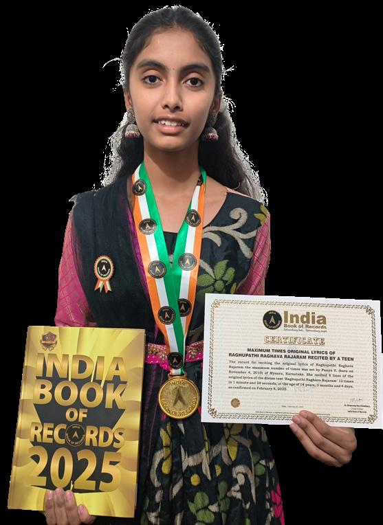 The record for reciting the original lyrics of Raghupathi Raghava Rajaram the maximum number of times was set by (born on November 4, 2010) of Mysuru, Karnataka. She recited 8 lines of the original lyrics of the divine text ‘Raghupathi Raghava Rajaram’ 12 times in 1 minute and 28 seconds, at the age of 14 years, 3 months and 4 days, as confirmed on February 8, 2025.