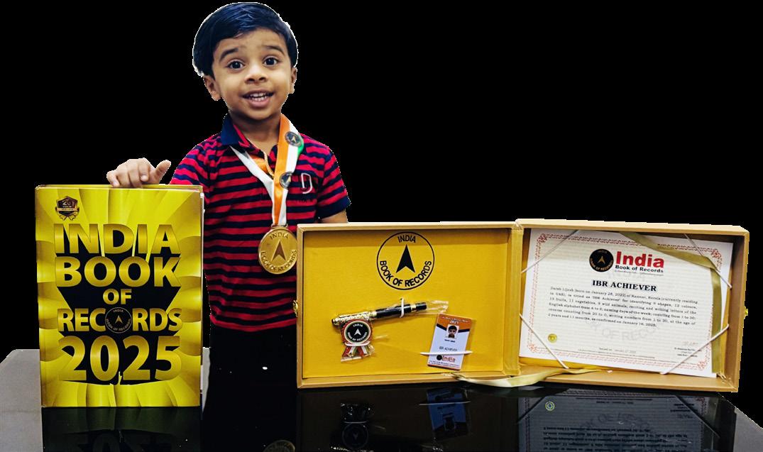 Darsh Lijesh (born on January 28, 2022) of Kannur, Kerala (currently residing in UAE), is titled as ‘IBR Achiever’ for identifying 9 shapes, 12 colours, 19 fruits, 11 vegetables, 9 wild animals; reciting and writing letters of the English alphabet from A to Z; naming days of the week; counting from 1 to 30;