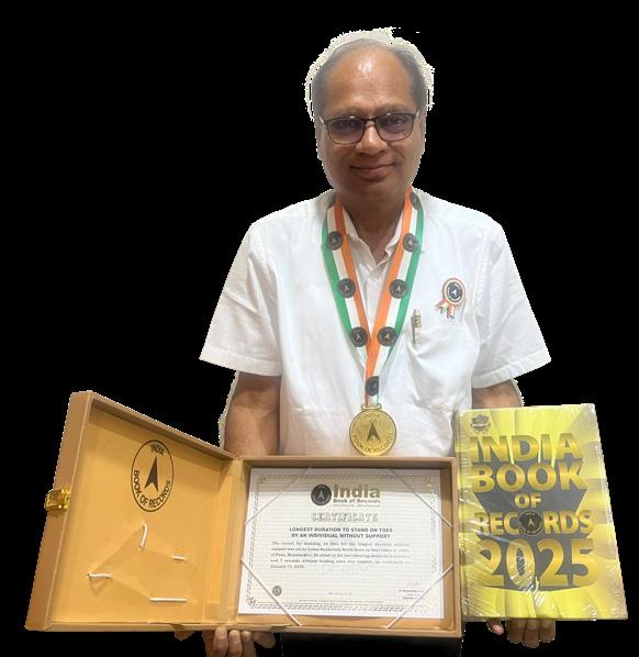 The record for standing on toes for the longest duration without support was set by Gokul Bankatlalji Rathi (born on September 6, 1960) of Pune, Maharashtra. He stood on his toes (wearing socks) for 6 minutes and 7 seconds without holding onto any support, as confirmed on January 14, 2025.