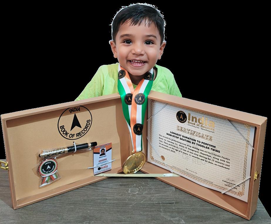 The record for performing non- stop skating was set by Utkrisht Pandya (born on January 13, 2022) of Dungarpur, Rajasthan, along with his twin. They performed 1.33 km of non-stop skating for 33 seconds, at the age of 2 and 24 days, as confirmed on