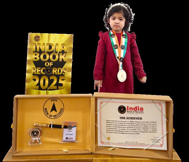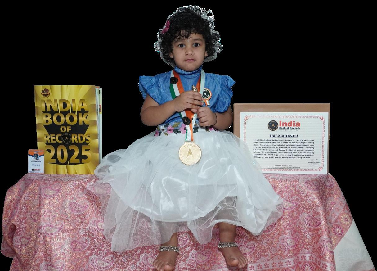 Inaaya Ivalkar (born on December 31, 2022) of Belagavi, Karnataka, is titled as ‘IBR Achiever’ for recalling the letters of the English alphabet, 5 sense organs, 6 opposite words; counting from 1 to 10; identifying 35 animals, 24 parts of the body, 12 fruits, 8 food items, 10 colours, 11 shapes, 8 vegetables, 14 actions, 14 professionals, 11 vehicles, 34 household items, 6 insects, 6 musical instruments; mimicking the sounds of 10 animals; and enacting 5 expressions, at the age of 2 years, as confirmed on January 6, 2025.