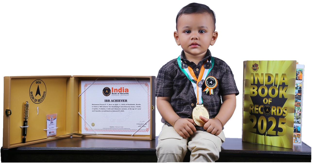Muhammad Nazaan P. T. (born on April 11, 2023) of Kozhikode, Kerala, is titled as ‘IBR Achiever’ for identifying 8 miscellaneous items, 3 birds, 2 reptiles, 5 vehicles, 3 wild and 3 domestic animals, at the age