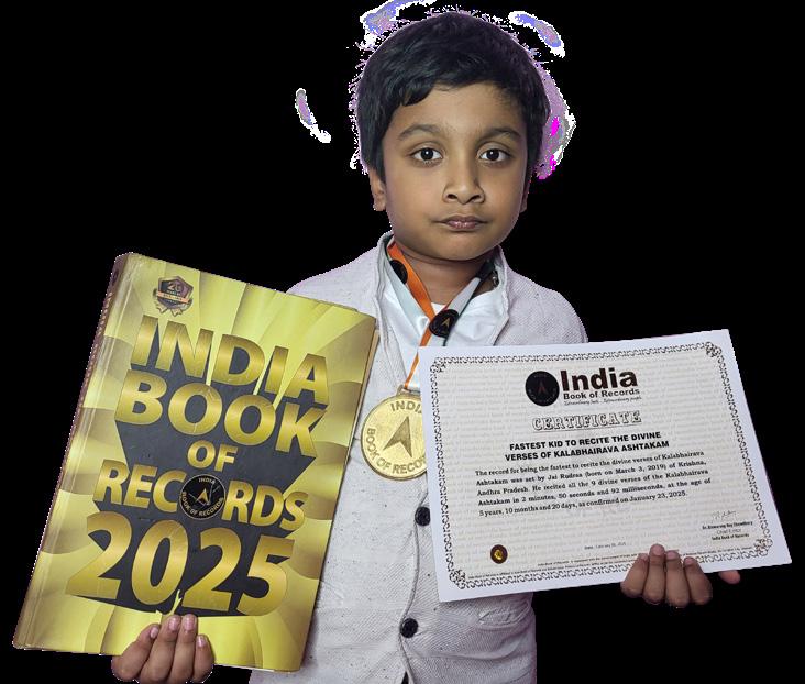 The record for being the fastest to recite the divine verses of Kalabhairava Ashtakam was set by Jai Rudraa (born on March 3, 2019) of Krishna, Andhra Pradesh. He recited all the 9 divine verses of the Kalabhairava Ashtakam in 2 minutes, 50 seconds and 92 milliseconds, at the age of 5 years, 10 months and 20 days, as confirmed on January 23, 2025.