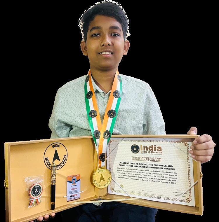 The record for being the fastest to recall the Preamble and Parts of the Indian Constitution in English was set by Saran U. (born on November 6, 2010) of Madurai, Tamil Nadu. He recalled the Preamble and 22 Parts of the Indian Constitution in English in 50 seconds, at the age of 14 years, 1 month and 27 days, as confirmed on January 2, 2025.