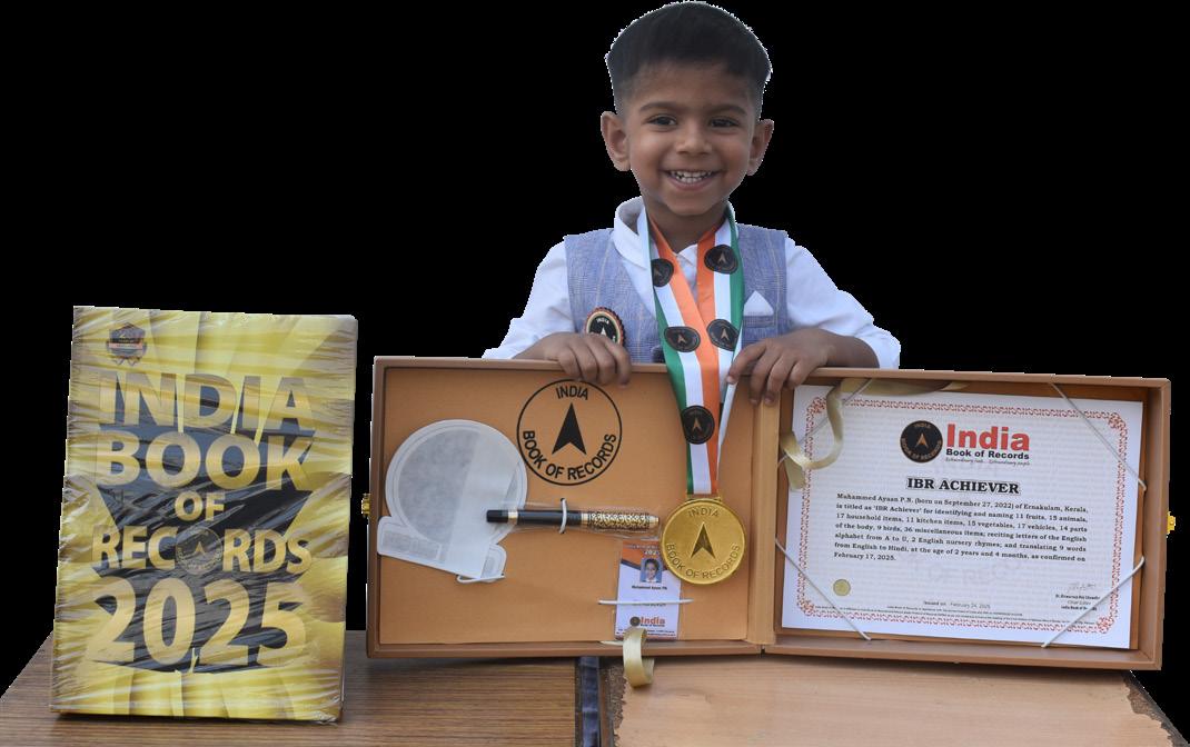 Adam Ewaan Zaaik (born on February 28, 2022) of Kasaragod, Kerala, is titled as ‘IBR Achiever’ for reciting one English nursery rhyme; counting from 1 to 10; identifying and naming 14 parts of the body, 7 colours, 5 professionals, 9 fruits, 7 animals and 2 birds, at the age of 2 years and 10 months, as confirmed on January 23, 2025.