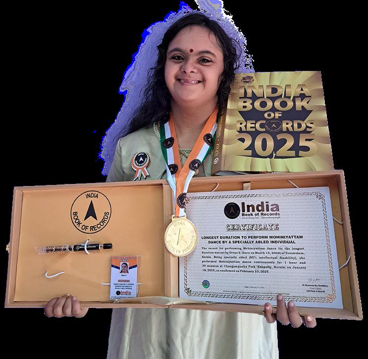 The record for performing Mohiniyattam dance for the longest duration was set by Divya S. (born on March 15, 2004) of Ernakulam, Kerala. Being specially abled (85% intellectual disability), she performed Mohiniyattam dance continuously for 1 hour and 30 minutes at Changampuzha Park (Edapally, Kerala) on January 18, 2025, as confirmed on February 10, 2025.