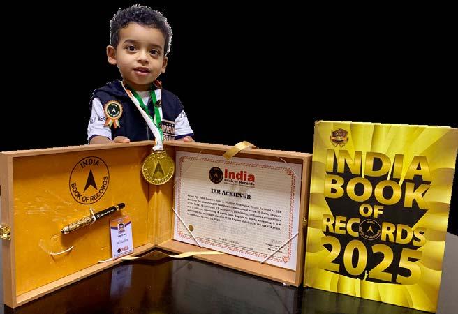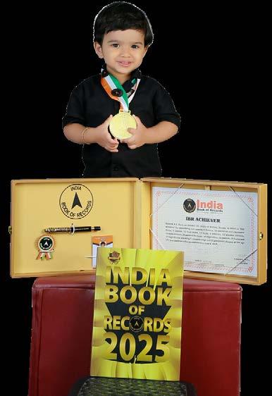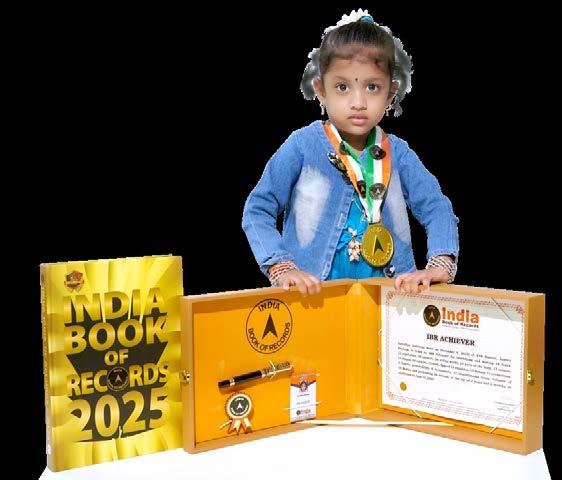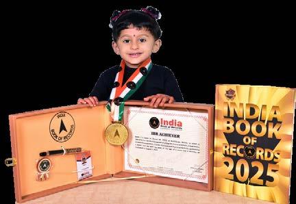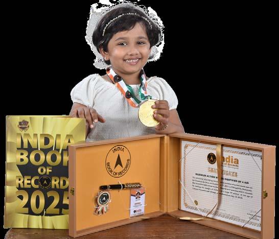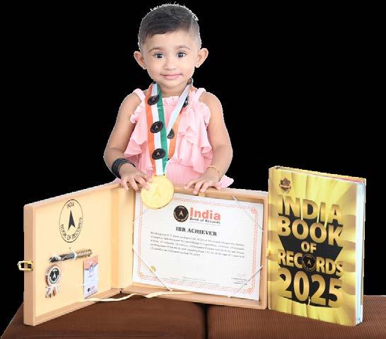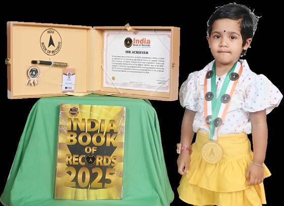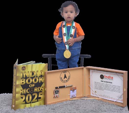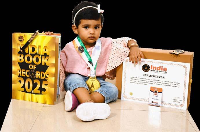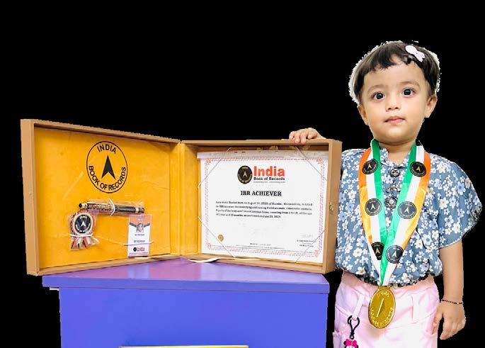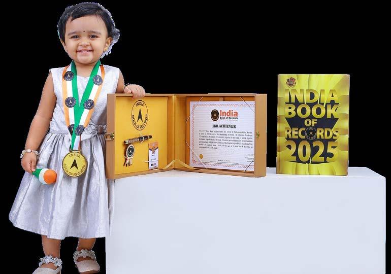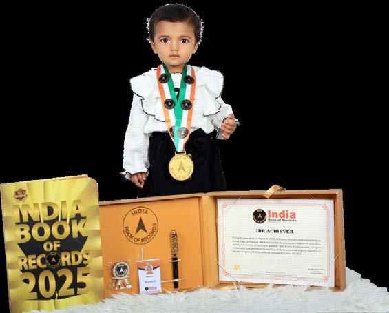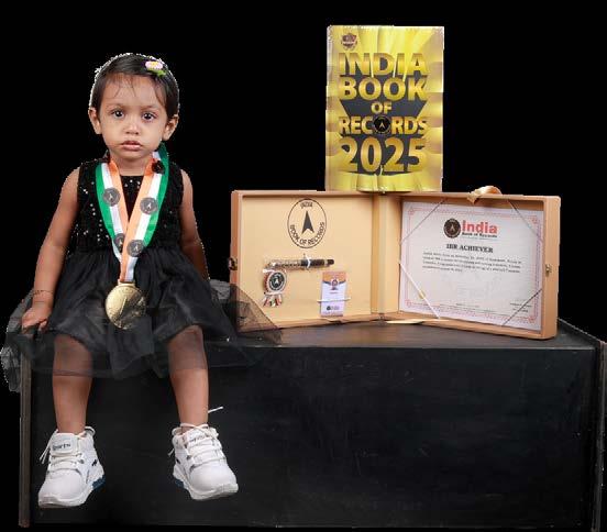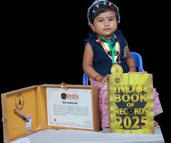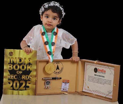 Saanvi K. (born on August 25, 2023) of Malappuram, Kerala, is titled as ‘IBR Achiever’ for identifying 5 vehicles, 5 animals, 5 vegetables, 5 fruits, 5 birds, 10 colours, 13 parts of the body and 13 associated pictures of the letters of the English alphabet; dancing on a song; sorting and stacking 7 coloured rings, at the age of 1 year and 9 months, as confirmed on June 21, 2025.
