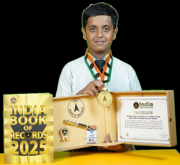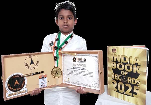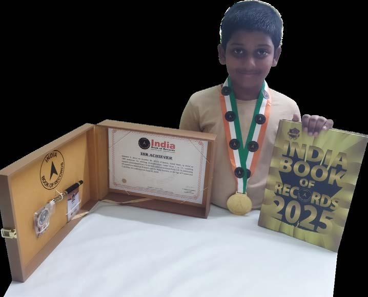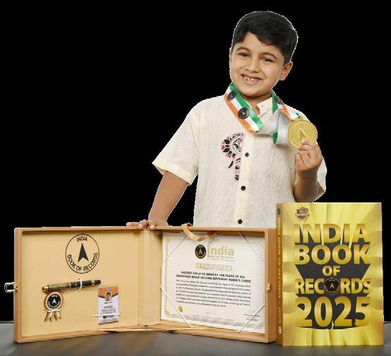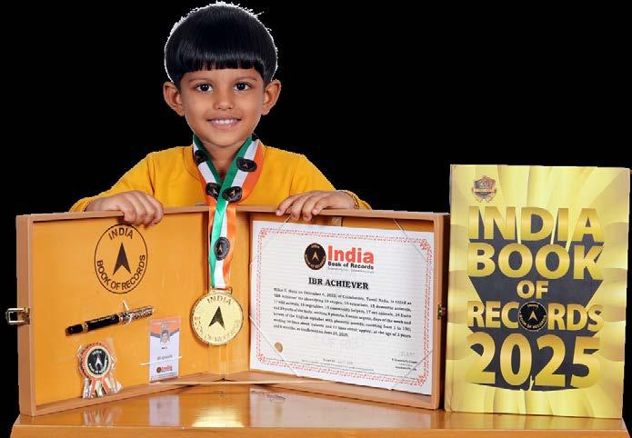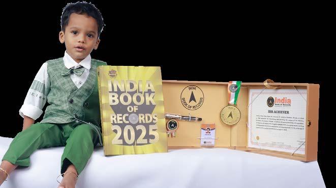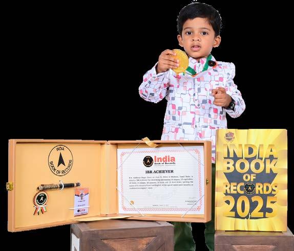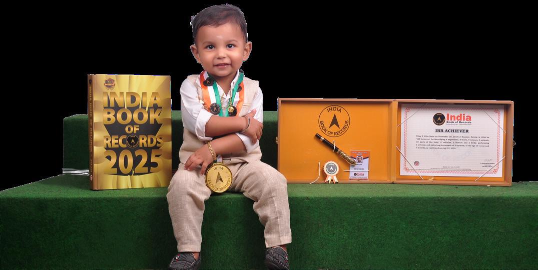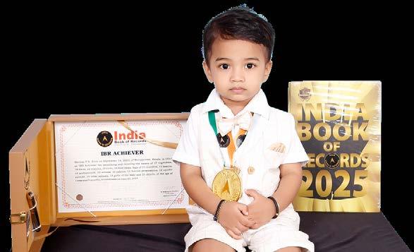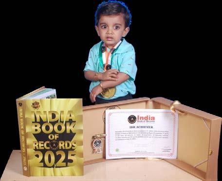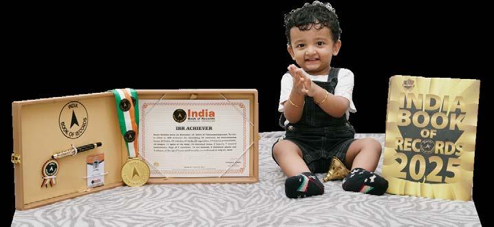 Rithvik A.S. (born on October 20, 2023) of Kollam, Kerala, is titled as ‘IBR Achiever’ for identifying and naming 6 flowers, 10 electrical and electronic items, 9 colours, 12 food items, 13 birds, 9 vehicles, 12 kitchen utensils, 14 farm animals, 20 parts of the body, 16 vegetables, 12 insects, 18 fruits and 17 ingredients; stacking 7 coloured rings and 32 geometric shapes, at the age of 1 year and 8 months, as confirmed on July 8, 2025.
