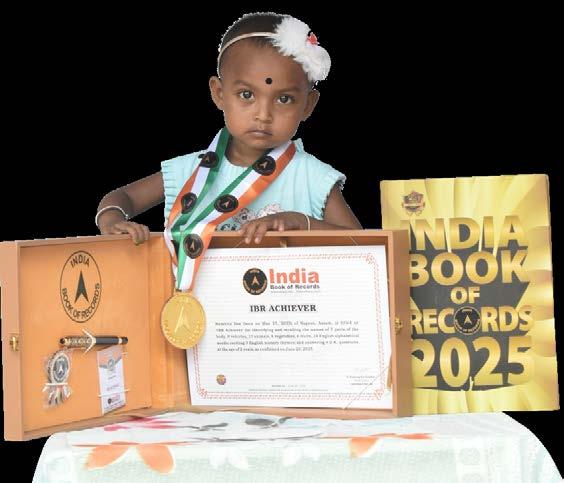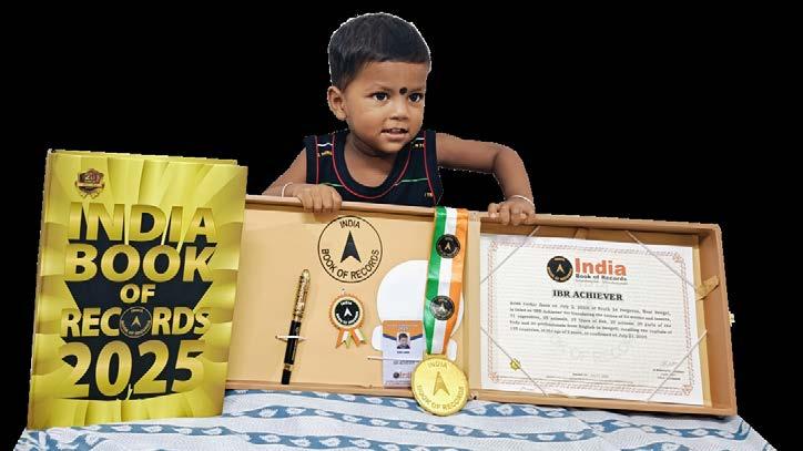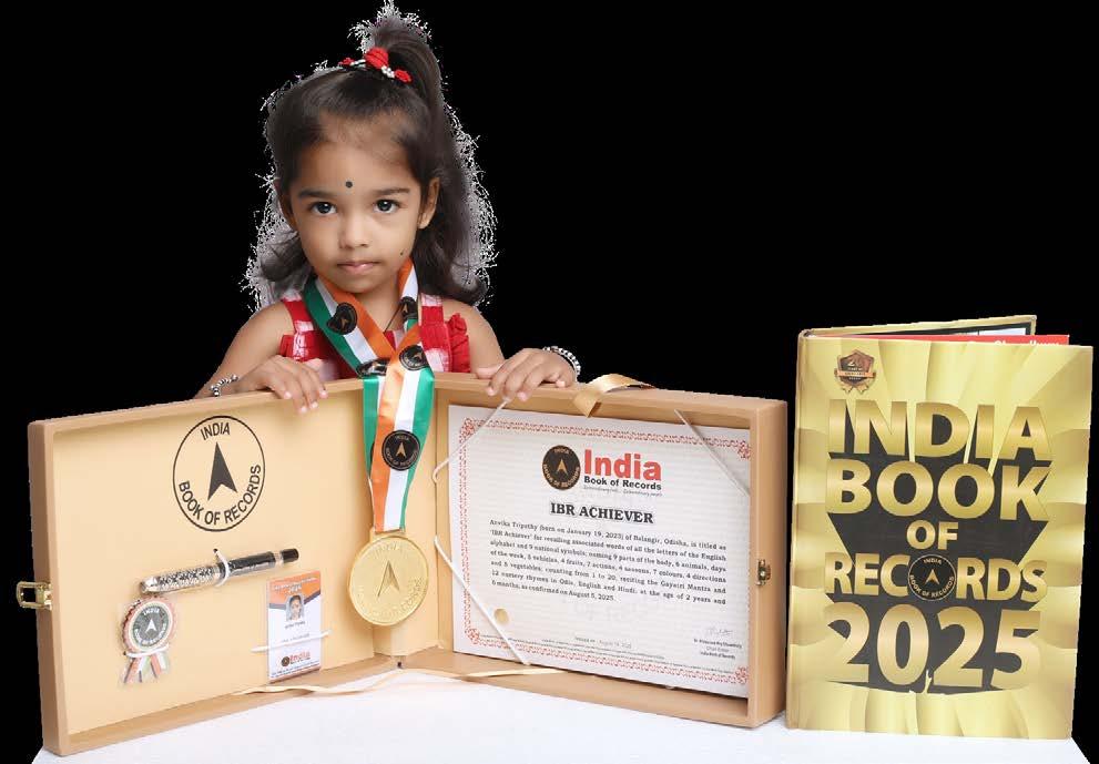 Anvika Tripathy (born on January 19, 2023) of Balangir, Odisha, is titled as ‘IBR Achiever’ for recalling associated words of all the letters of the English alphabet and 9 national symbols; naming 9 parts of the body, 6 animals, days of the week, 5 vehicles, 4 fruits, 7 actions, 4 seasons, 7 colours, 4 directions and 5 vegetables; counting from 1 to 20; reciting the Gayatri Mantra and 12 nursery rhymes in Odia, English and Hindi, at the age of 2 years and 6 months, as confirmed on August 5, 2025.