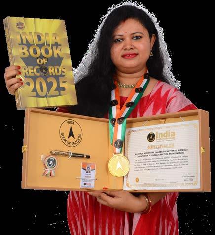 The record for painting the maximum number of miniature images of national symbols on a single sheet was set by Payel Das Santra (born on June 6, 1988) of Howrah, West Bengal. She painted 12 miniature colourful images of national symbols (each measuring 3 cm x 3.5 cm) on a single sheet, using water colours, as confirmed on July 30, 2025.