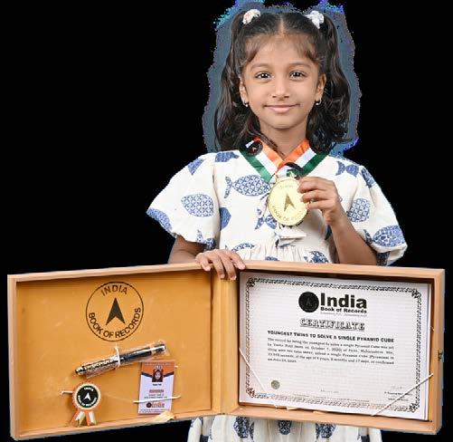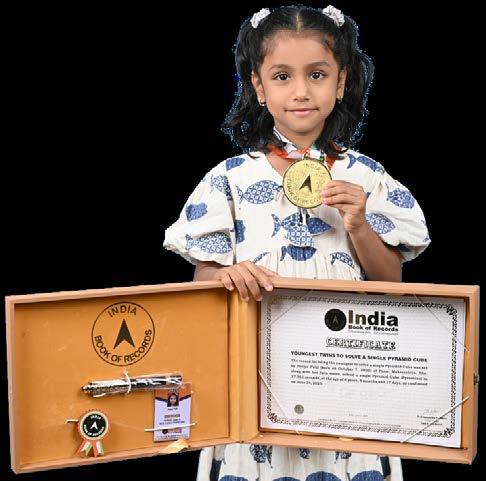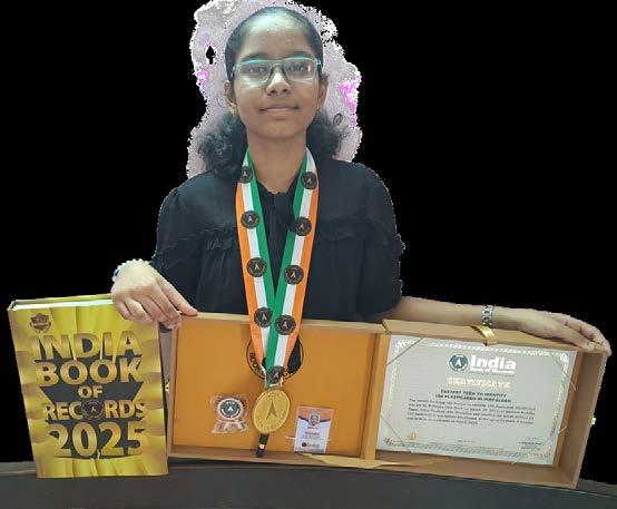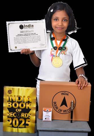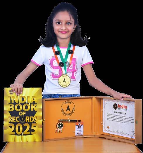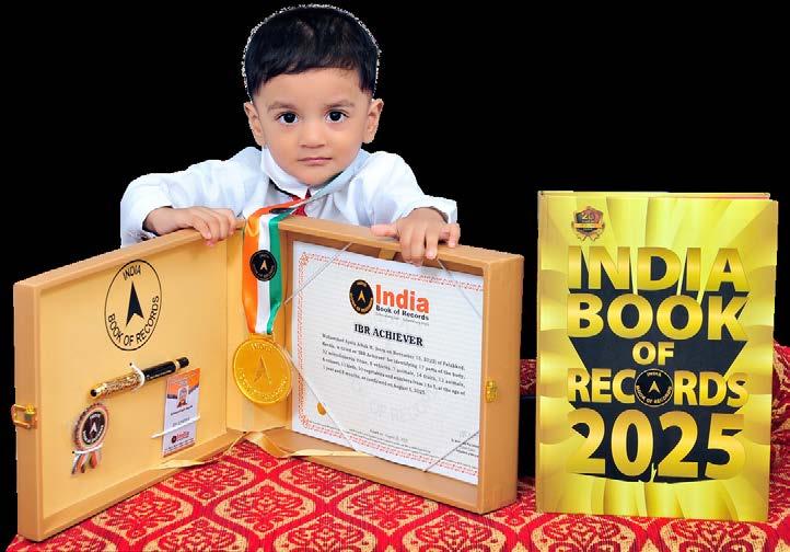 Zada Neziha (born on May 13, 2022) of Thrissur, Kerala, is titled as ‘IBR Achiever’ for identifying 34 miscellaneous items, 16 food items, 10 colours, 12 parts of the body, 24 fruits, 18 animals, 17 vegetables, 6 medicines and 26 letters of the English alphabet; answering 10 G.K. questions; counting from 1 to 10; sorting and completing a 5- shape puzzle of 20 pieces, at the age of 3 years and 1 month, as confirmed on June 21, 2025.