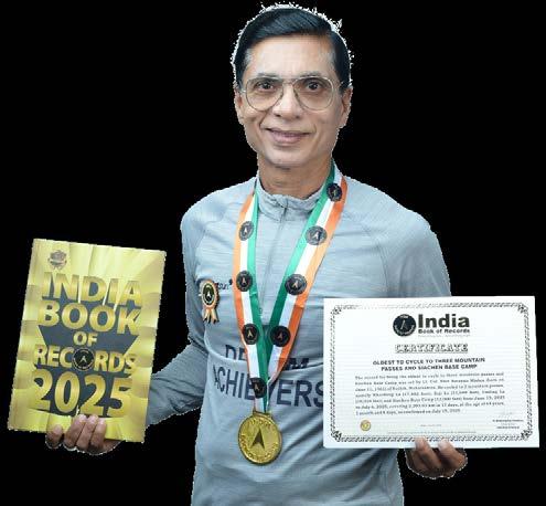 The record for being the oldest to cycle to three mountain passes and Siachen Base Camp was set by Lt. Col. Shiv Narayan Mishra (born on June 11, 1961) of Nashik, Maharashtra. He cycled to 3 mountain passes, namely Khardung La (17,982 feet), Zoji La (11,649 feet), Umling La (19,024 feet) and Siachen Base Camp (12,000 feet) from June 19, 2025 to July 6, 2025; covering 2,203.02 km in 17 days, at the age of 64 years, 1 month and 8 days, as confirmed on July 19, 2025.