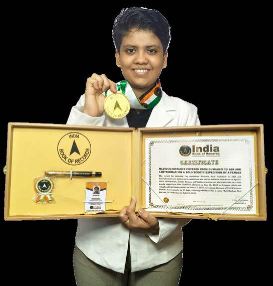 The record for covering the maximum distance from Guwahati to J&K and KanyaKumari on a solo scooty expedition was set by Ashmita Paul (born on April 5, 2005) of Guwahati, Assam. Being a self defence instructor, she embarked on a solo scooty expedition from Guwahati (Assam) on May 18, 2025 to Srinagar (J&K) and completed it at Kanyakumari on June 13, 2025, covering a distance of 7,234 km on a Yamaha Aerox scooty in 27 days, creating awareness for a cause ‘Beti Bachao, as confirmed on 2025.