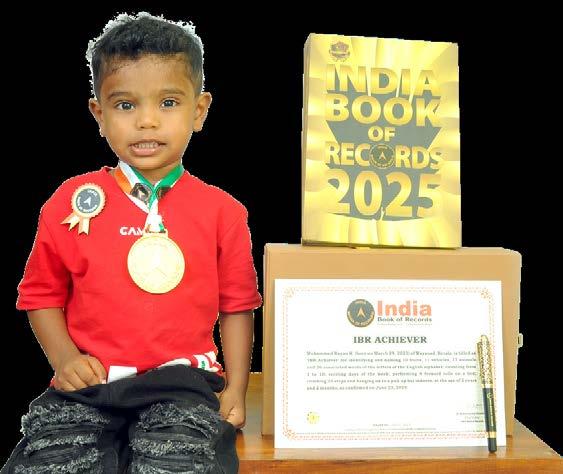 Rithvik A.S. (born on October 20, 2023) of Kollam, Kerala, is titled as ‘IBR Achiever’ for identifying and naming 6 flowers, 10 electrical and electronic items, 9 colours, 12 food items, 13 birds, 9 vehicles, 12 kitchen utensils, 14 farm animals, 20 parts of the body, 16 vegetables, 12 insects, 18 fruits and 17 ingredients; stacking 7 coloured rings and 32 geometric shapes, at the age of 1 year and 8 months, as confirmed on July 8, 2025.