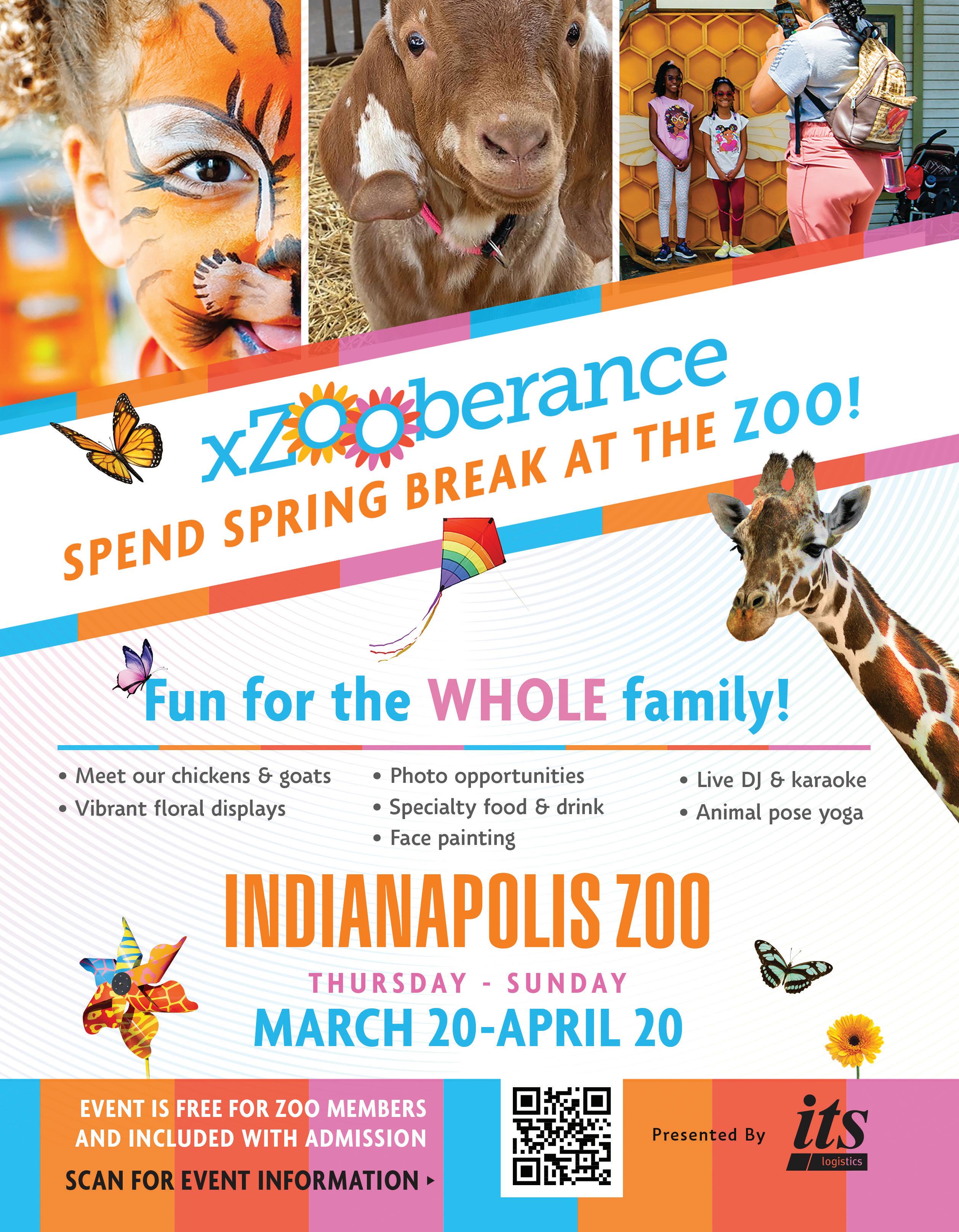 xZOOberance Spring Festival Through April 20. The Bicentennial Pavilion will be buzzing with live music and dancing, along with spring-centric art and fun activities. Location: Indianapolis Zoo, indianapoliszoo.com