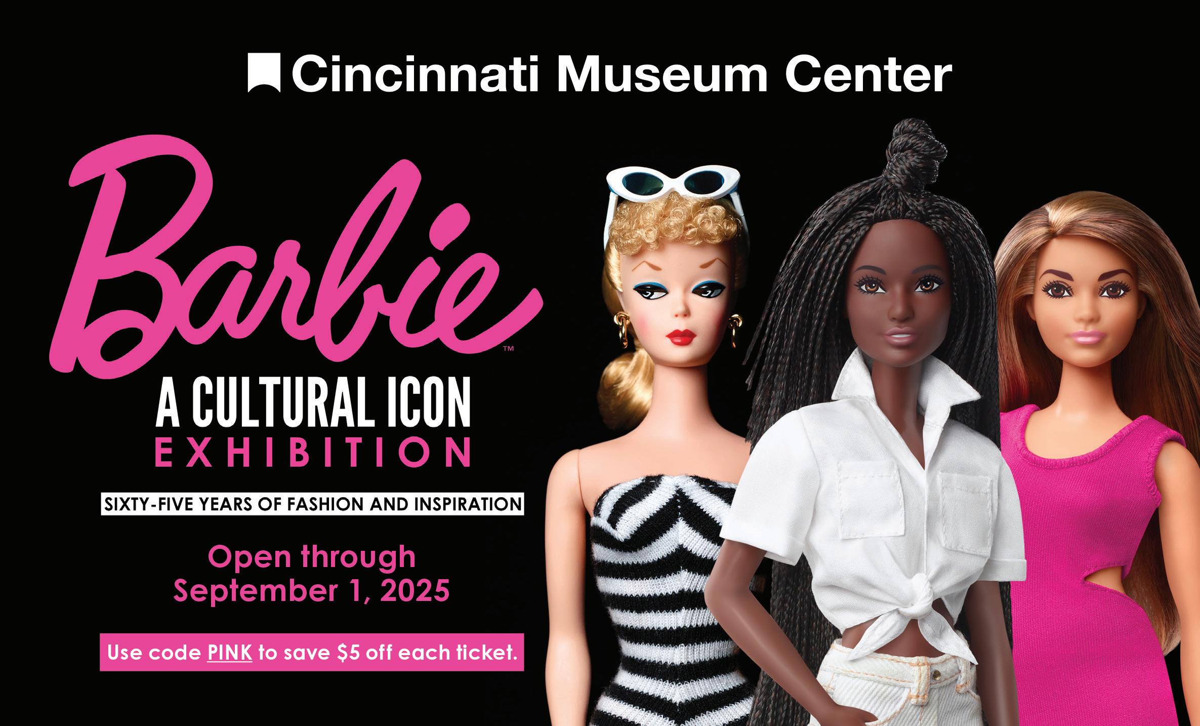 Barbie: A Cultural Icon Exhibition Through September 1. The exhibition celebrates Barbie as a reflection of culture, featuring a priceless collection of over 300 artifacts from the 66-year history. Location: Cincinnati Museum Center, cincymuseum.org