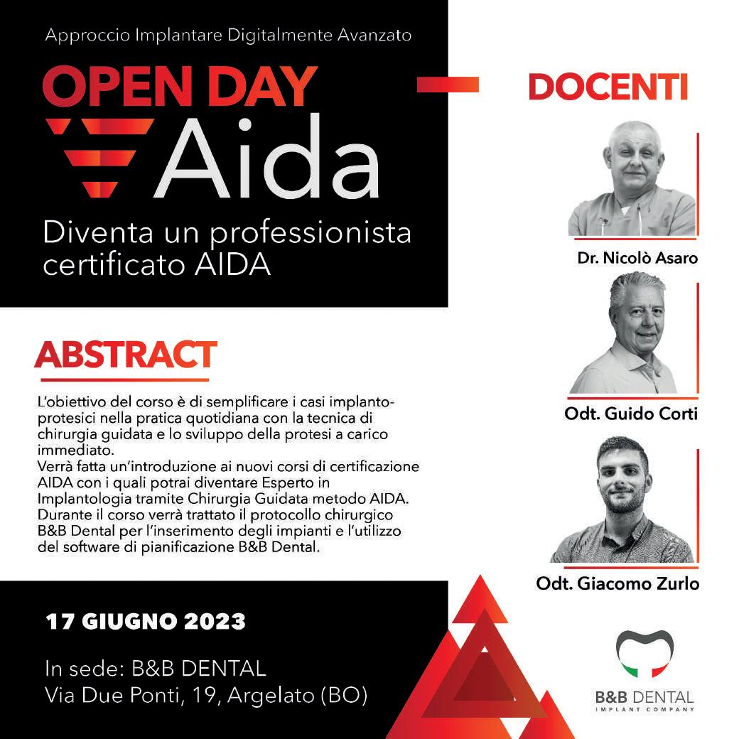 Questo corso avanzato di chirurgia guidata è progettato per migliorare le conoscenze e le competenze dei medici attraverso l’osservazione e l’attuazione di interventi in live surgery. Il corso sarà sviluppato nell’arco di 5 weekend a partire da ottobre (un weekend ogni 2/3 settimane), durante ogni weekend saranno affrontate tematiche specifiche nel campo dell’implantologia computer guidata e sulla progettazione di casi clinici attraverso l’uso del software di B&B Dental. Nell’Ultimo weekend, al termine dell’esperienza formativa, ogni medico avrà la possibilità di eseguire l’intervento chirurgico progettato durante il corso sul proprio paziente. Al termine del corso sarà possibile sostenere l’esame per ottenere la certificazione professionale AIDA di “Esperto di implantologia con chirurgia guidata”, rilasciata dall’importante ente di certificazione TUV Italia.