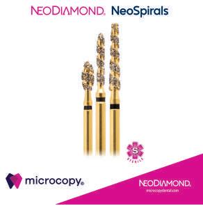 Microcopy's NeoDiamond Spiral burs are specifically designed to deliver superior cutting efficiency. They enable fast and easy crown preparation and abrasion of different materials such as ceramics, hypermineralized enamel and old metal restorations.
