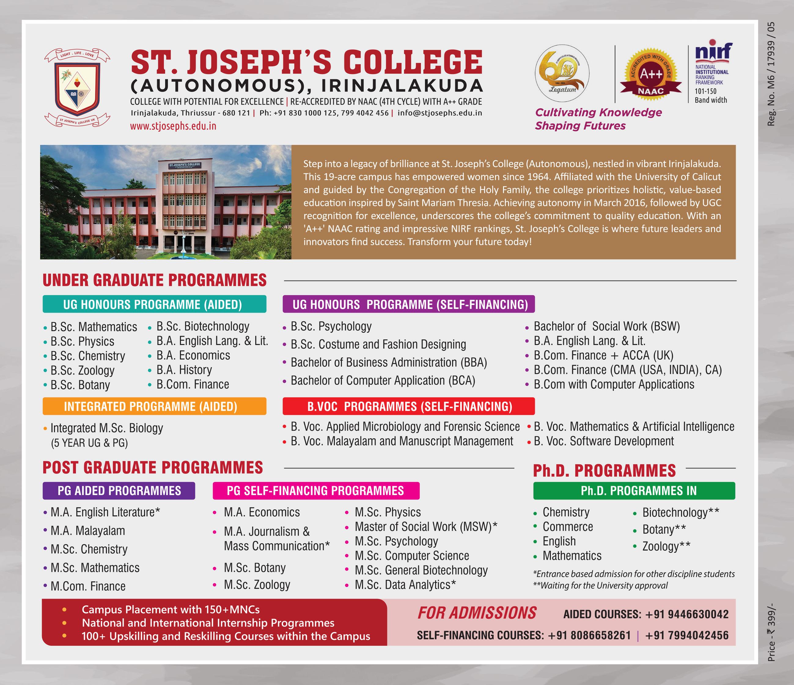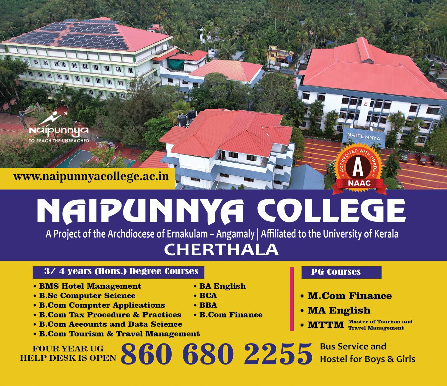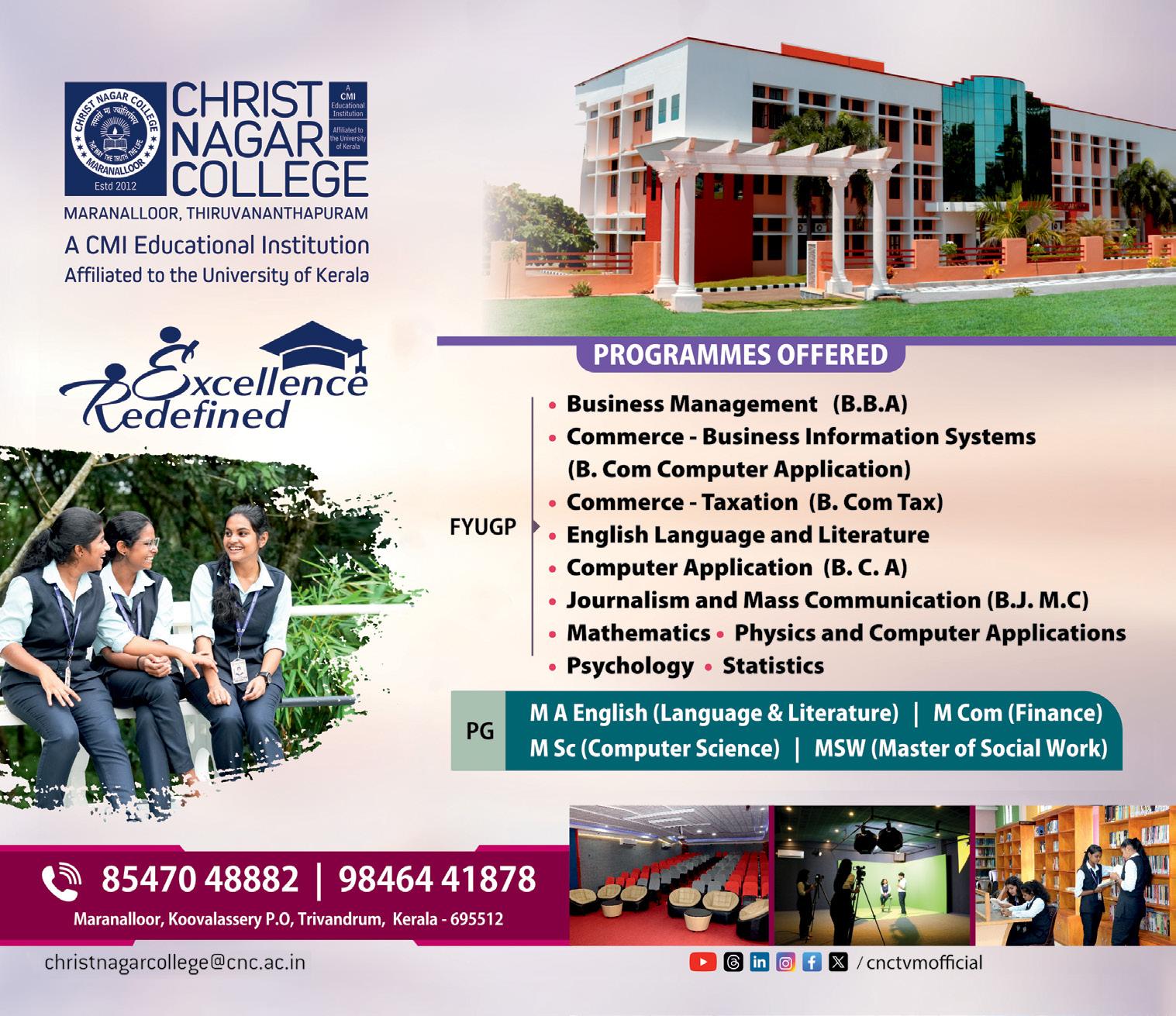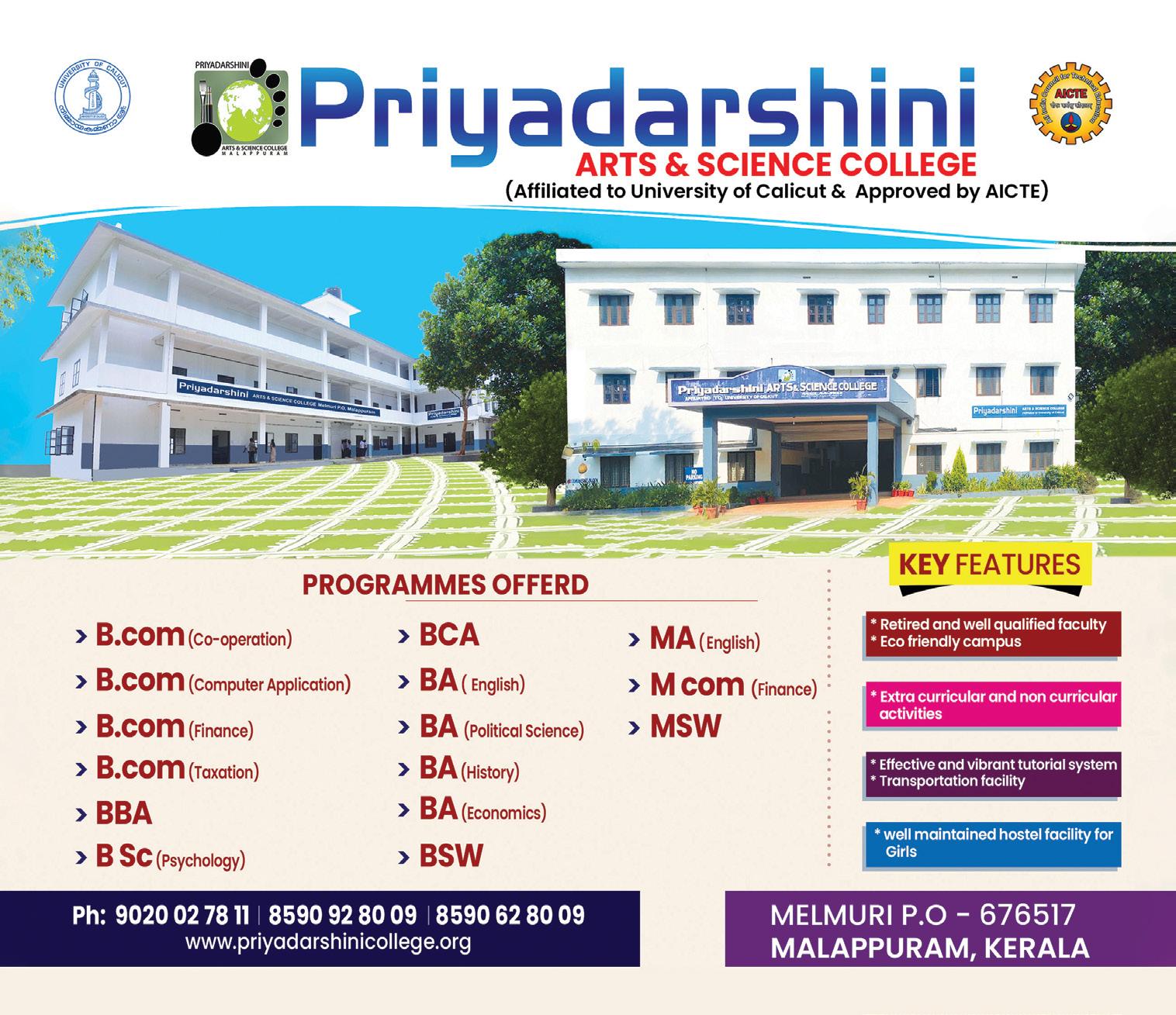Courses: BA Economics, Politics, English, Malayalam, BSc Physics, Chemistry, Botany, B Com Finance, BBA, BCA, MA Politics, MSc
