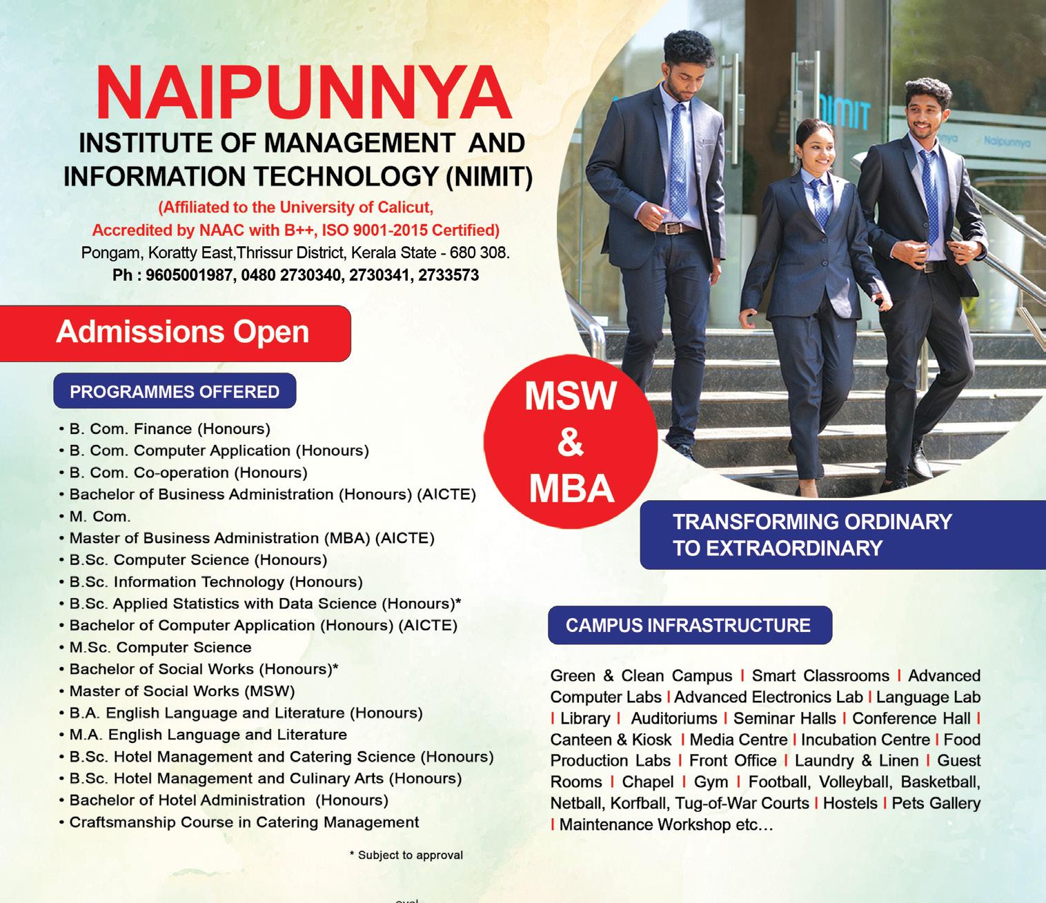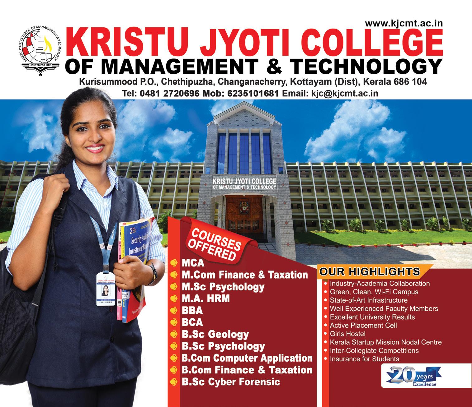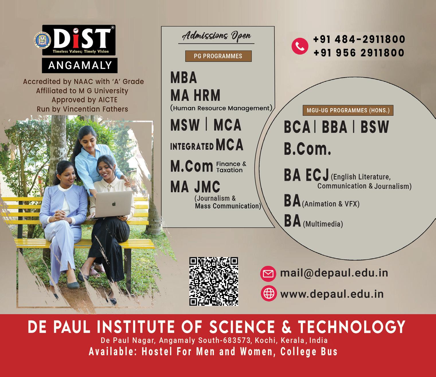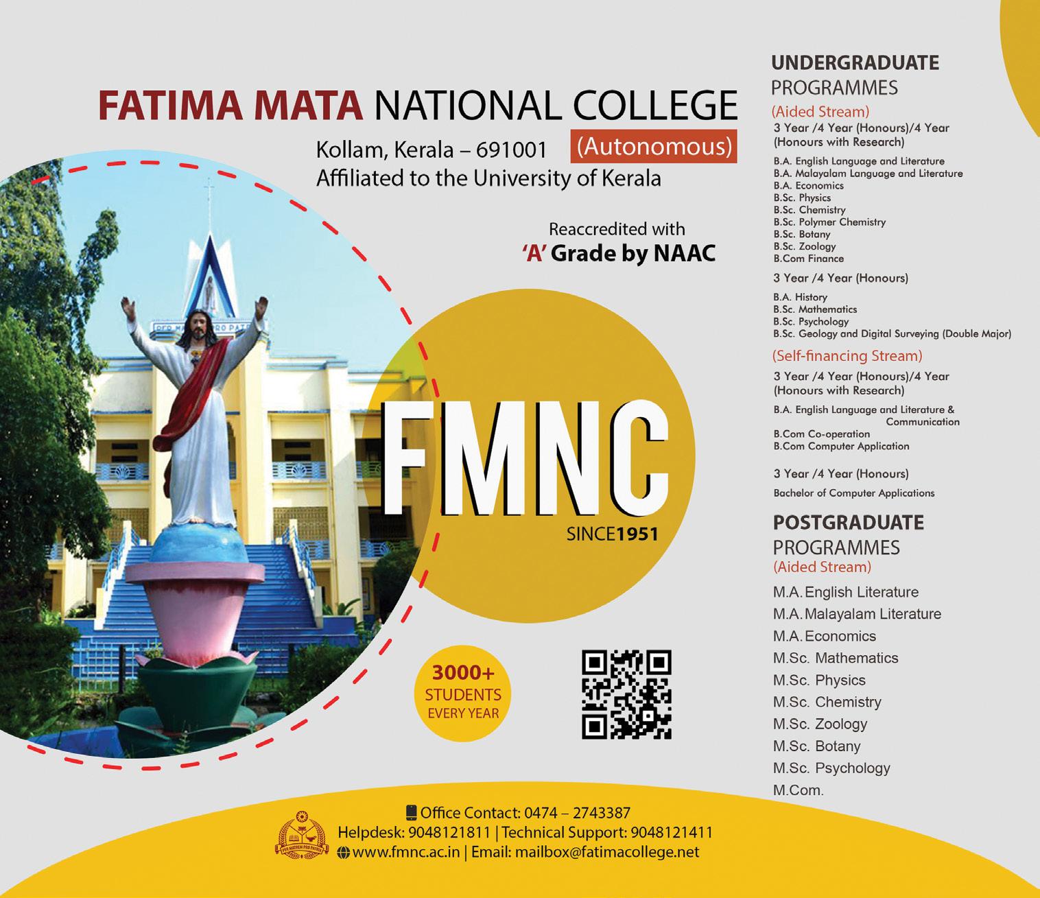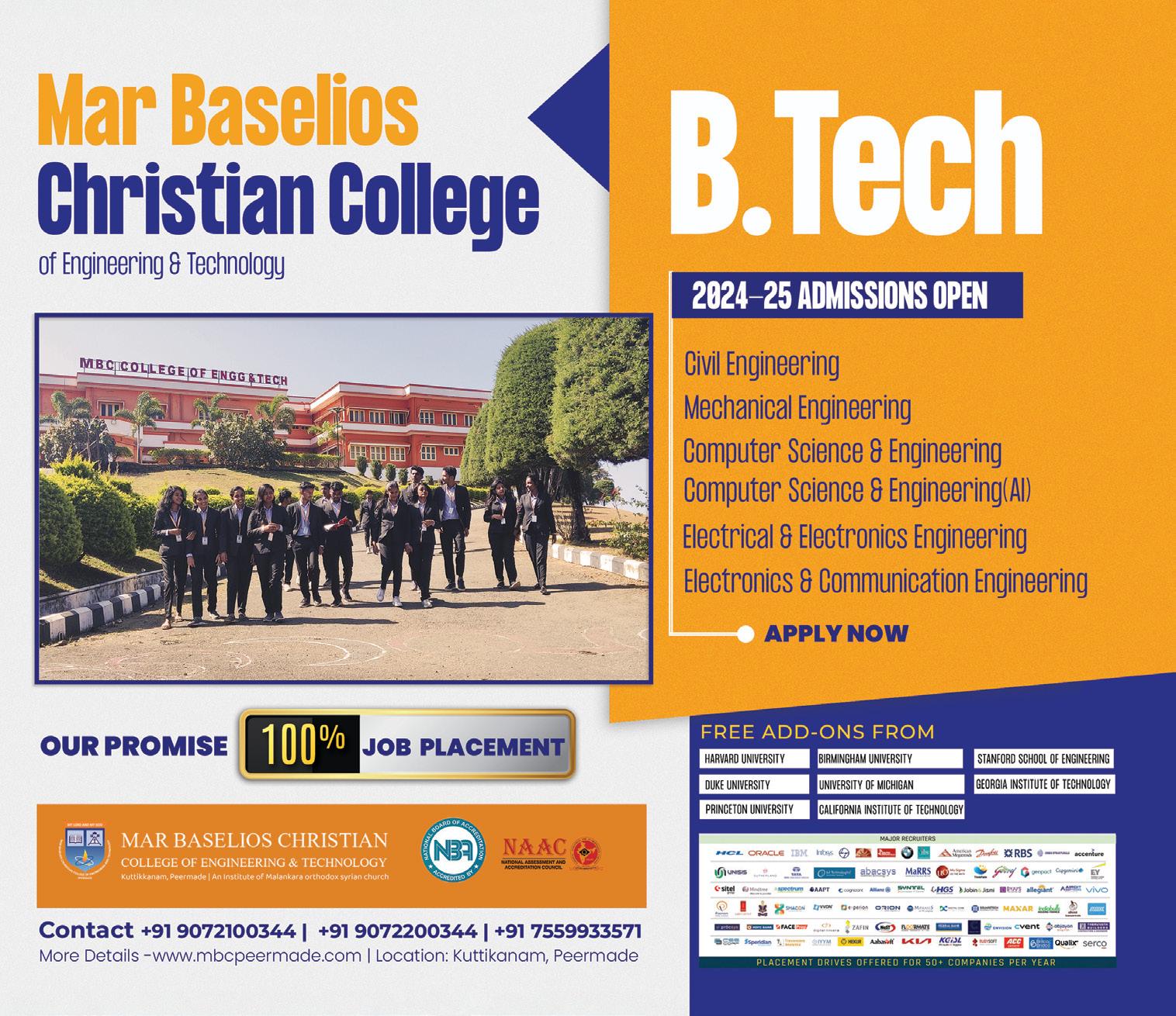 Courses: BA Economics, Politics, English, Malayalam, BSc Physics, Chemistry, Botany, B Com Finance, BBA, BCA, MA Politics, MSc
