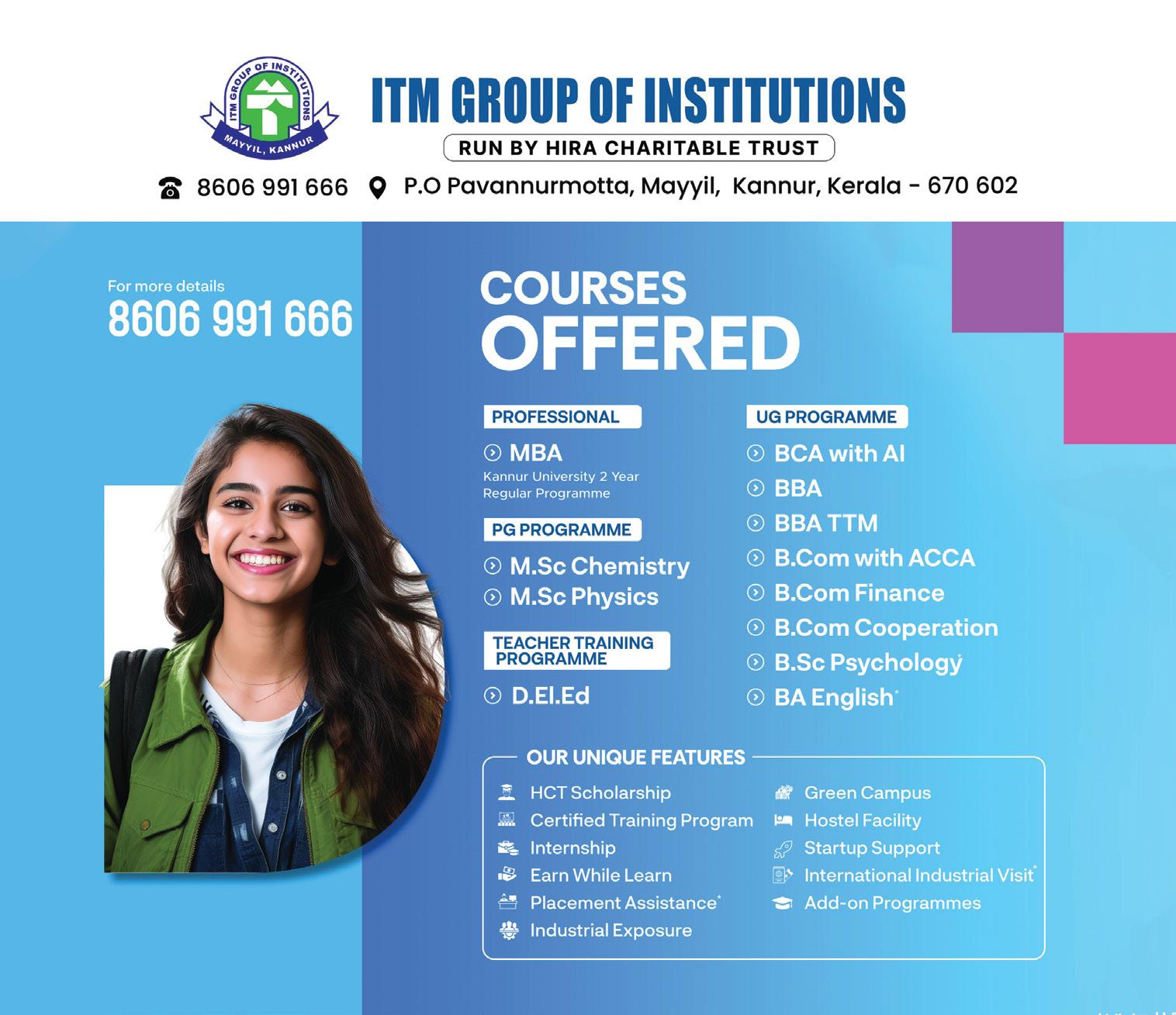 Courses: B Ed Social Science, Physical Science, Natural Science, English, Mathematics, Malayalam etc.