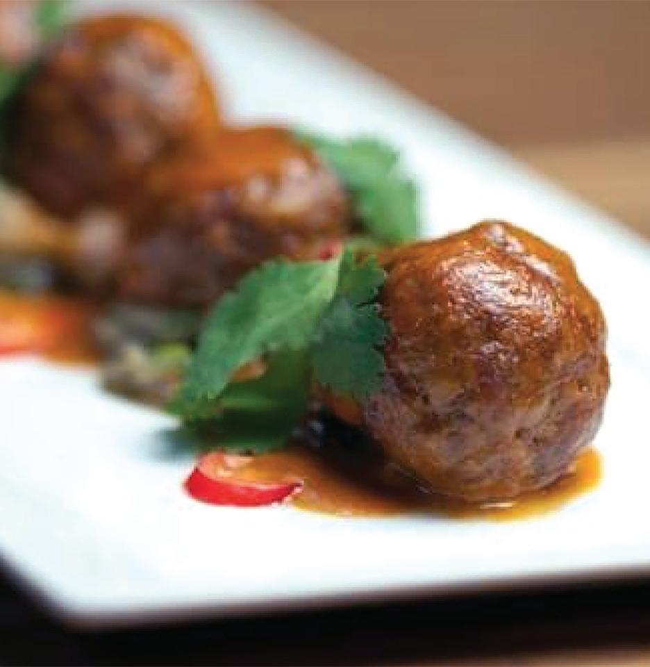 The Oxtail Bahn Mi sandwich was too interesting to pass up. A soul food-inspired Vietnamese mash-up, it was served on a hefty slice of crusty bread, slathered with a fiery kimchi mayo, then stacked with melt-in-your-mouth oxtail meat cooked to a luscious buttery texture. Candied jalapeños, pickled daikon radish, and thin slices of freshshaved carrot added a clean crunch to the rich sandwich. It was served with crispy-on-the-outside and soft-and-pillowy-on-the-inside cottage fries. The result was a study of balanced contrasts—soft and crunchy, hot and cold, sweet and spicy.